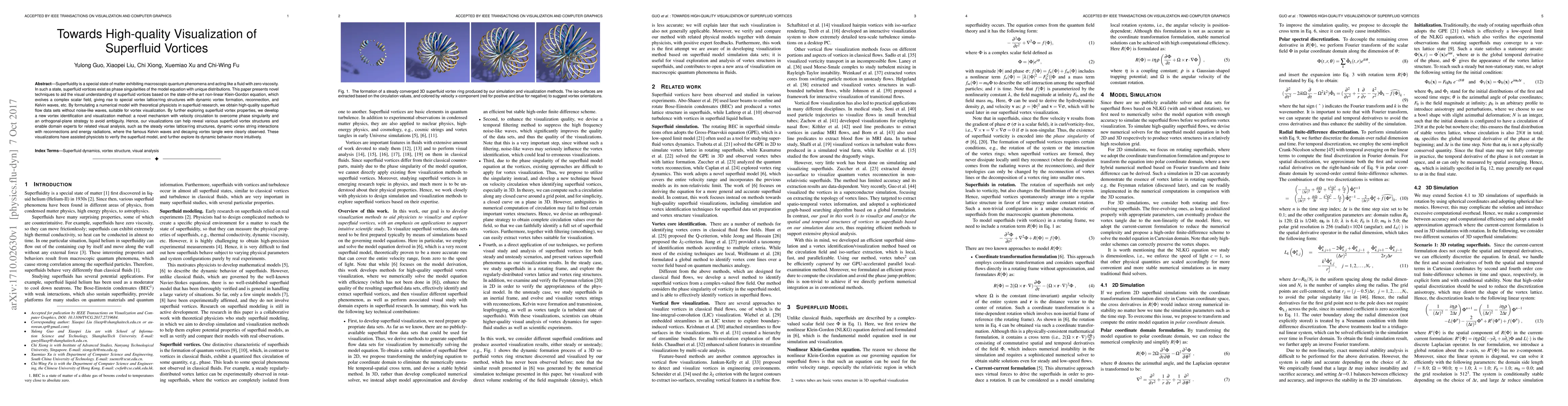 The research presents novel techniques for visualizing superfluid vortices using a non-linear Klein-Gordon equation, which models a complex scalar field. The authors develop a numerical model with theoretical physicists, obtain high-quality superfluid flow data sets, and introduce a new vortex identification and visualization method based on velocity circulation and an orthogonal-plane strategy.