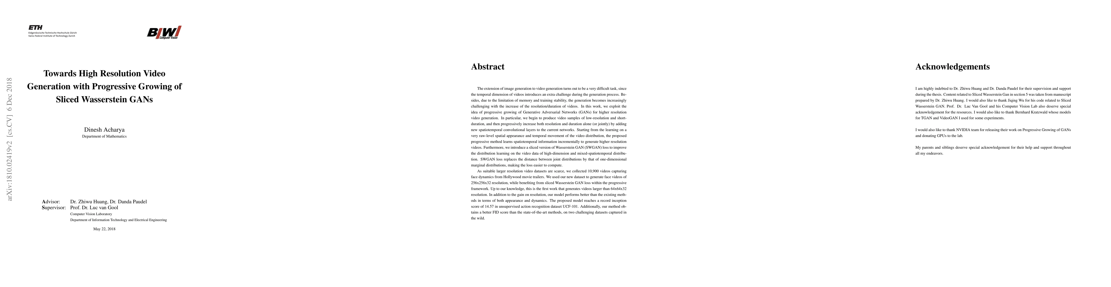 This paper proposes a progressive growing method for high-resolution video generation using Sliced Wasserstein GANs (SWGANs). It incrementally increases video resolution and duration by adding spatiotemporal convolutional layers, achieving better distribution learning and generating photorealistic face videos of 256x256x32 resolution.