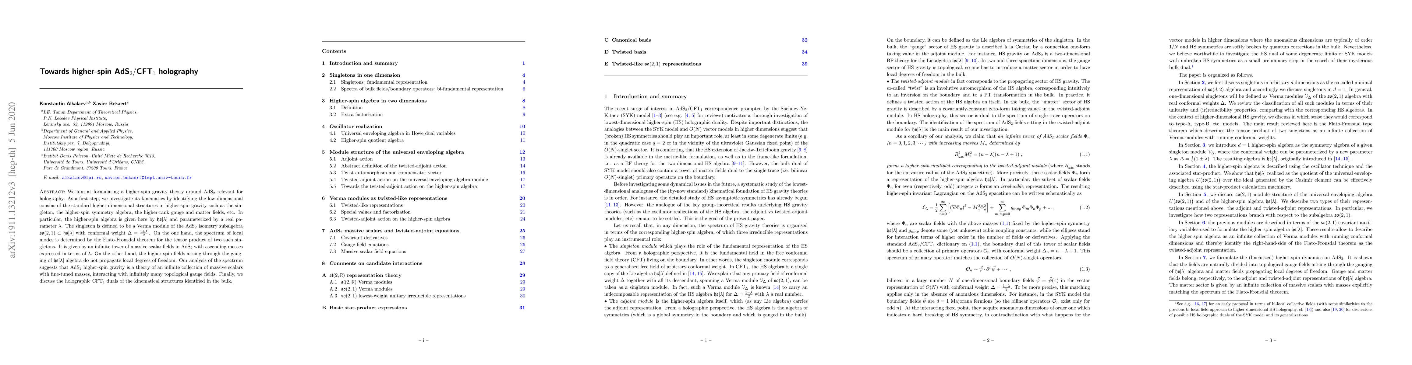 This paper develops a higher-spin gravity theory in AdS$_2$ and investigates its kinematic structures, showing that it comprises an infinite collection of massive scalar fields interacting with topological gauge fields. The dual conformal field theory in 1D is also explored.