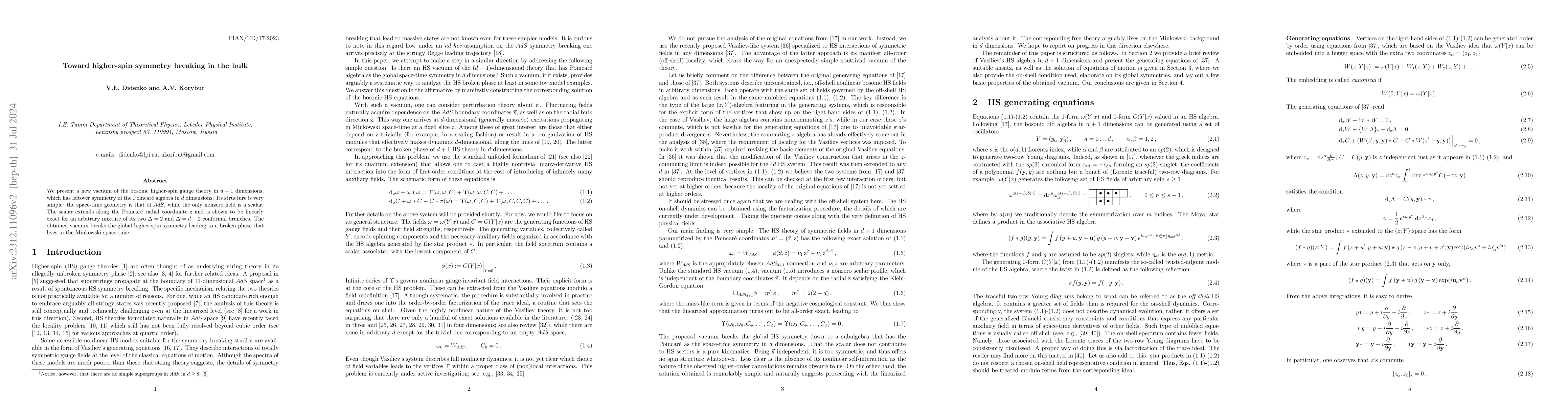 This paper introduces a new vacuum in bosonic higher-spin gauge theory with a simplified AdS space-time geometry and a single scalar field, demonstrating linear exactness for conformal branches. This vacuum breaks global higher-spin symmetry, transitioning to a broken phase in Minkowski space-time.