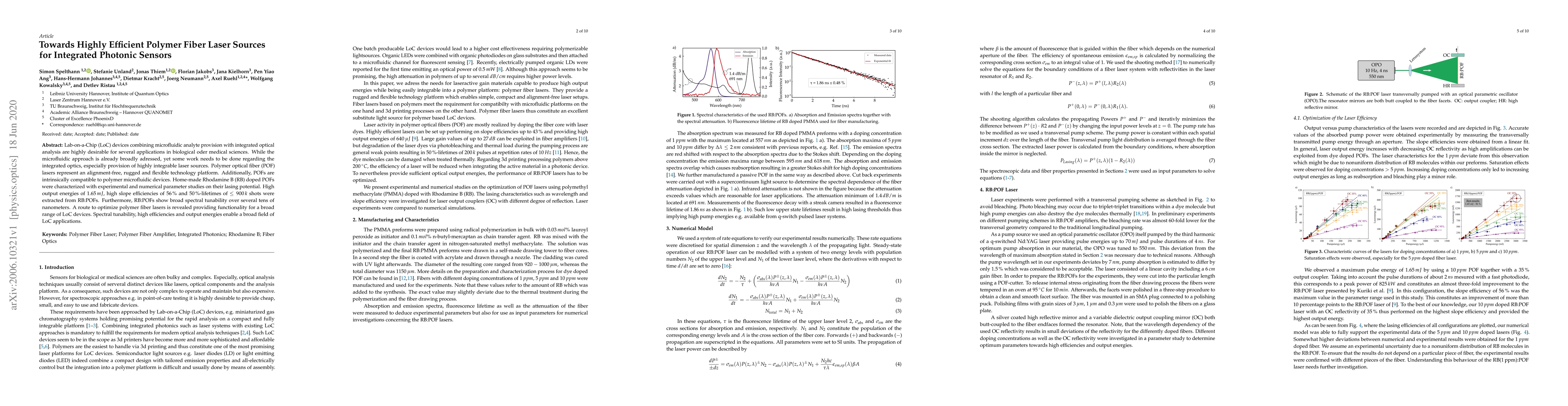 This paper explores the development of highly efficient polymer optical fiber (POF) lasers for integration into lab-on-a-chip (LoC) devices, achieving high output energies, slope efficiencies, and spectral tunability, thus addressing the need for robust laser sources in microfluidic systems. The study demonstrates the potential of Rhodamine B-doped POFs for various LoC applications.