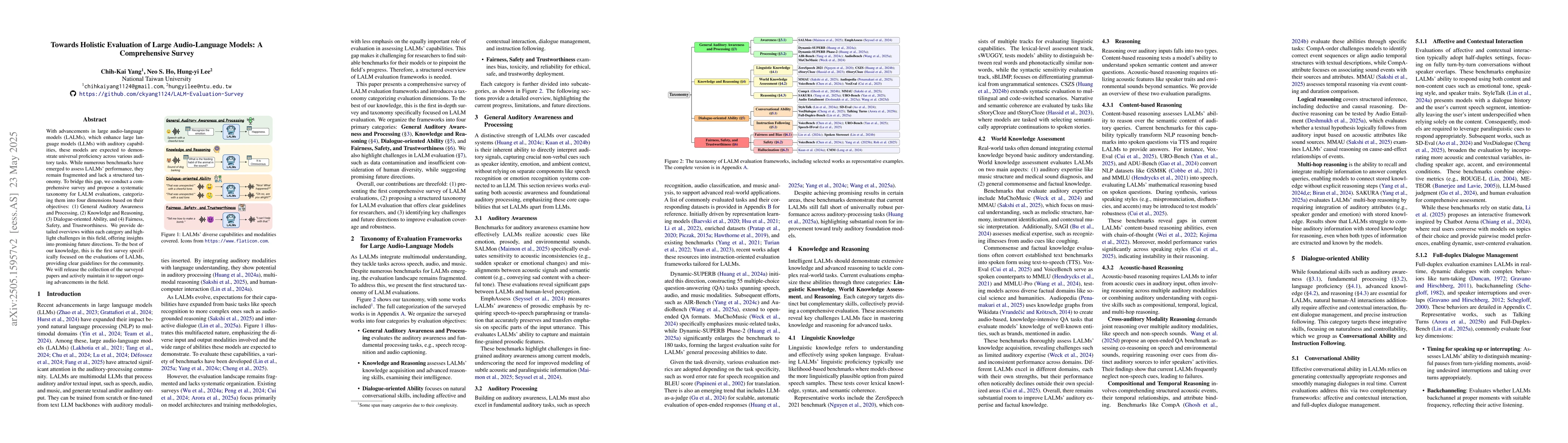This paper proposes a comprehensive taxonomy for evaluating large audio-language models, categorizing them into four dimensions: general auditory awareness, knowledge and reasoning, dialogue-oriented ability, and fairness, safety, and trustworthiness.