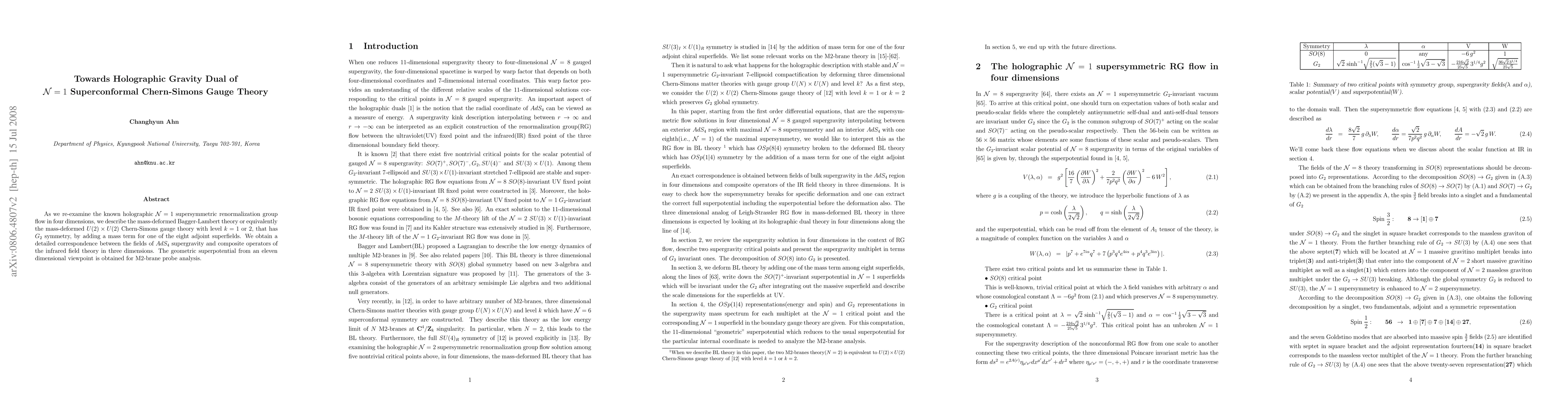 As we re-examine the known holographic N=1 supersymmetric renormalization group flow in four dimensions, we describe the mass-deformed Bagger-Lambert theory or equivalently the mass-deformed U(2) x U(2) Chern-Simons gauge theory with level k=1 or 2, that has G_2 symmetry, by adding a mass term for one of the eight adjoint superfields. We obtain a detailed correspondence between the fields of AdS_4 supergravity and composite operators of the infrared field theory in three dimensions. The geometric superpotential from an eleven dimensional viewpoint is obtained for M2-brane probe analysis.