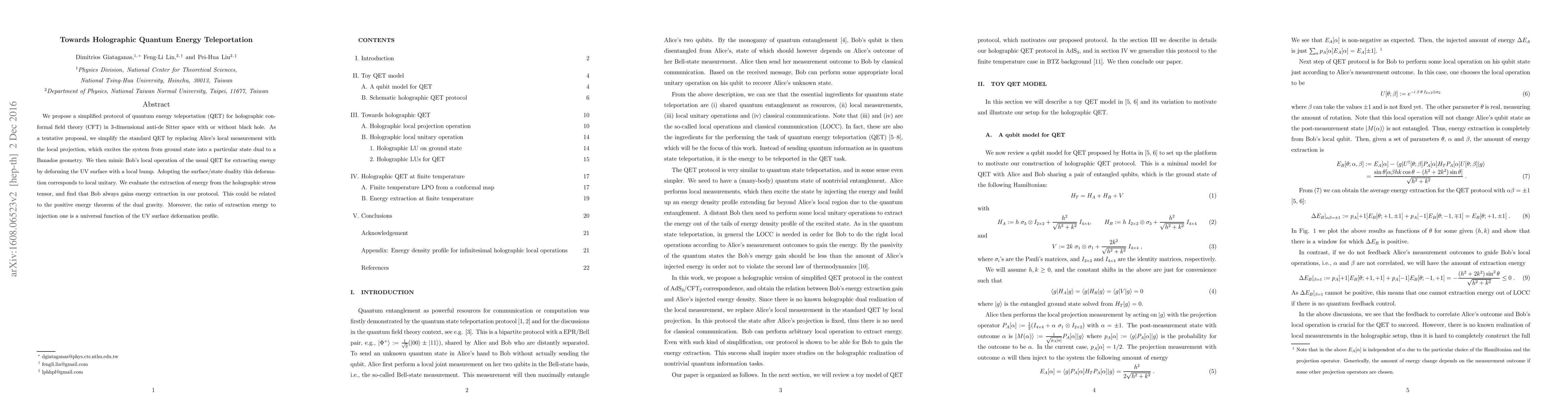 We propose a simplified protocol of quantum energy teleportation (QET) for holographic conformal field theory (CFT) in 3-dimensional anti-de Sitter space with or without black hole. As a tentative proposal, we simplify the standard QET by replacing Alice's local measurement with the local projection, which excites the system from ground state into a particular state dual to a Banados geometry. We then mimic Bob's local operation of the usual QET for extracting energy by deforming the UV surface with a local bump. Adopting the surface/state duality this deformation corresponds to local unitary. We evaluate the extraction of energy from the holographic stress tensor, and find that Bob always gains energy extraction in our protocol. This could be related to the positive energy theorem of the dual gravity. Moreover, the ratio of extraction energy to injection one is a universal function of the UV surface deformation profile.