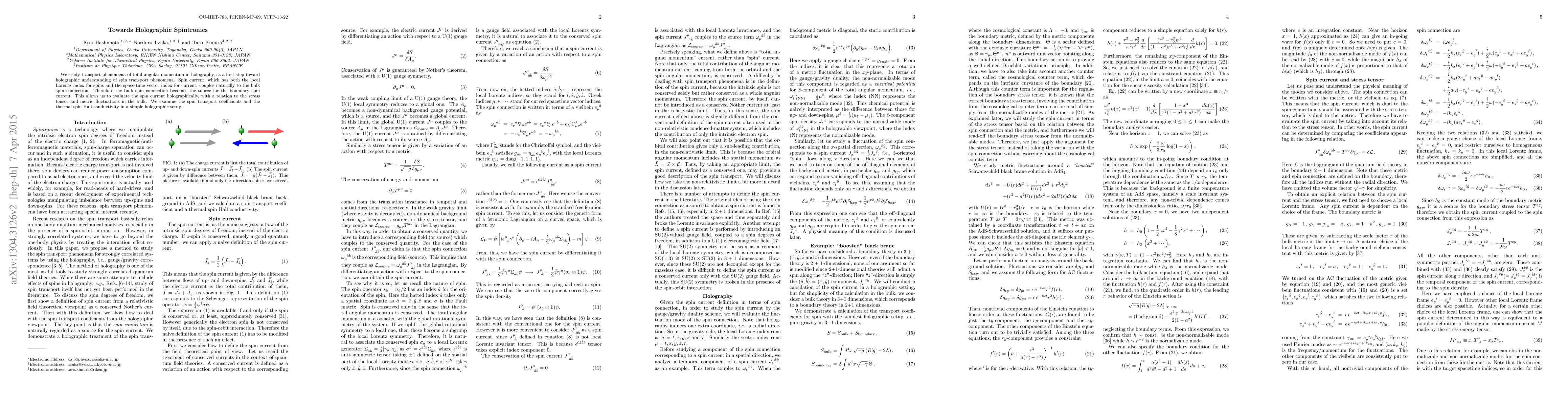 We study transport phenomena of total angular momentum in holography, as a first step toward holographic understanding of spin transport phenomena. Spin current, which has both the local Lorentz index for spins and the space-time vector index for current, couples naturally to the bulk spin connection. Therefore the bulk spin connection becomes the source for the boundary spin current. This allows us to evaluate the spin current holographically, with a relation to the stress tensor and metric fluctuations in the bulk. We examine the spin transport coefficients and the thermal spin Hall conductivity in a simple holographic setup.
