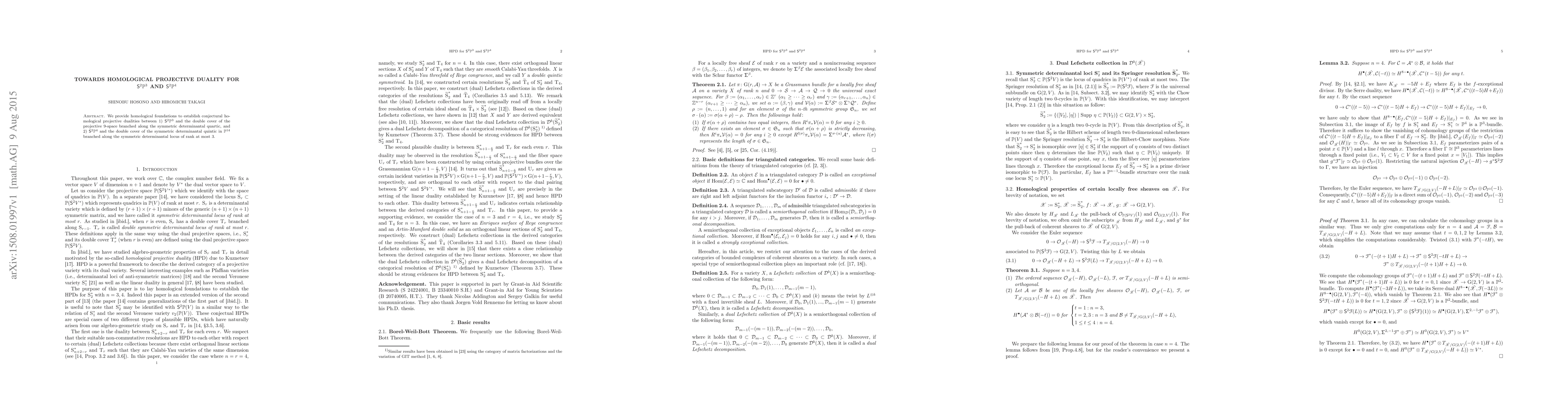We provide homological foundations to establish conjectural homological projective dualities between 1) S^2 P^3 and the double cover of the projective 9-space branched along the symmetric determinantal quartic, and 2) S^2 P^4 and the double cover of the symmetric determinantal quintic in the projective 14-space branched along the symmetric determinantal locus of rank at most 3.
