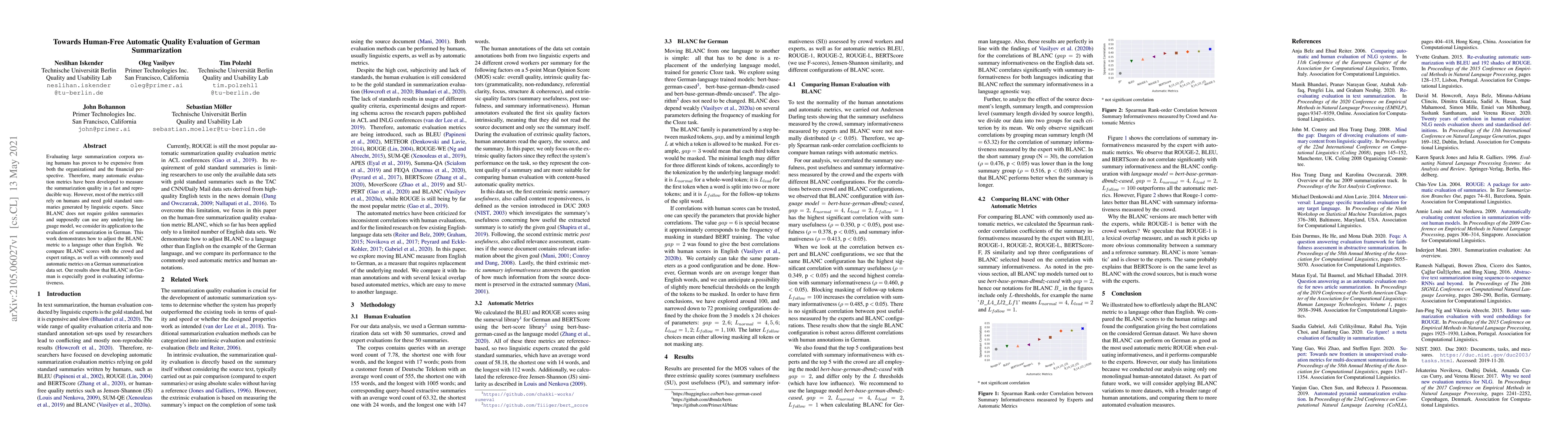 This research adapts the BLANC metric, which doesn't require human-generated gold standard summaries, for evaluating German summarization. Comparisons with human ratings, expert scores, and other automatic metrics on a German dataset show BLANC's effectiveness, particularly in assessing informativeness.