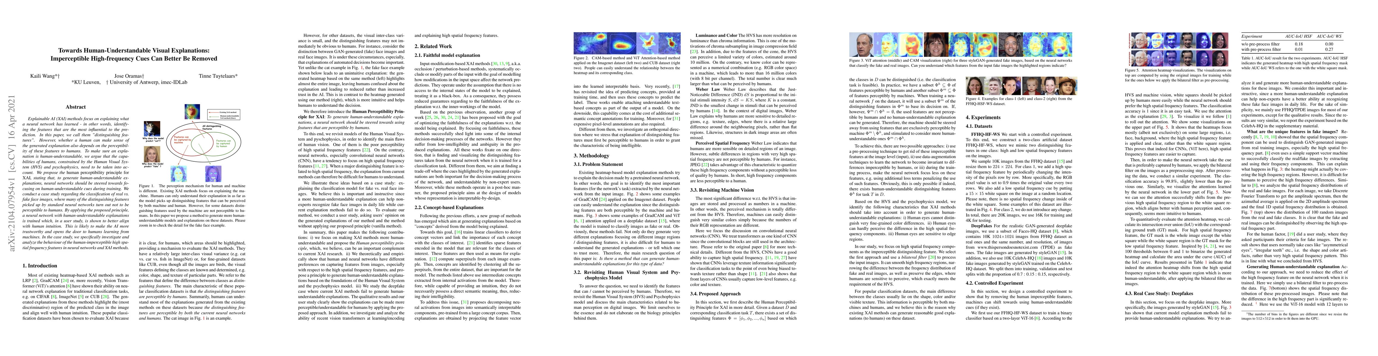 This paper proposes the "human perceptibility principle for Explainable AI" to ensure that neural networks focus on perceptible features during training, making explanations more understandable to humans. The study demonstrates improved alignment with human intuition and trustworthiness in a case of classifying real vs. fake face images by removing imperceptible high-frequency cues.