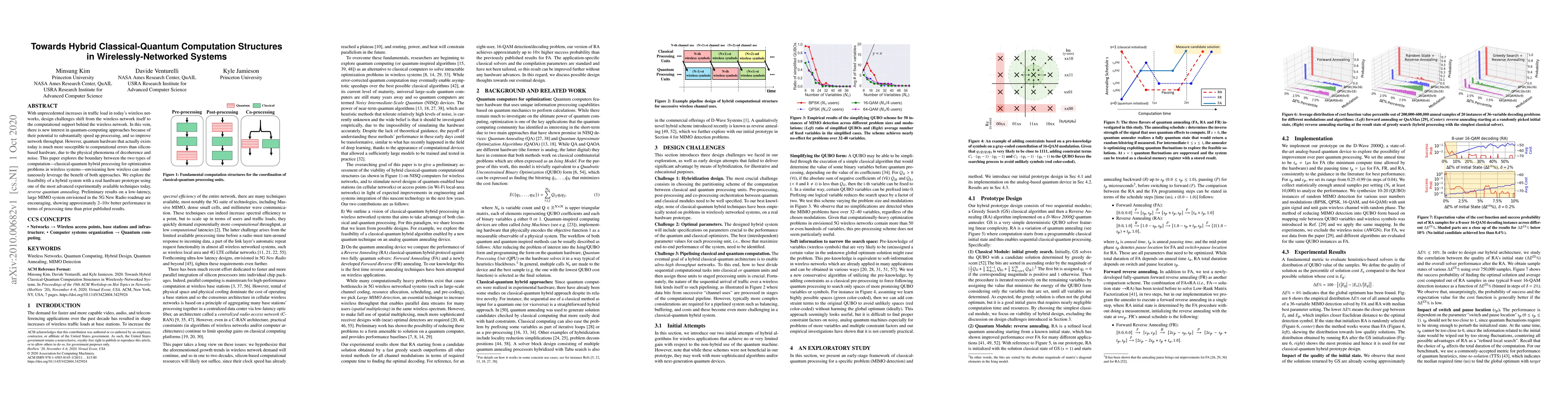 This paper investigates hybrid classical-quantum computation for optimizing wireless network processing, leveraging quantum annealing to address decoherence and noise issues. Preliminary results demonstrate significant improvements in processing time for a 5G MIMO system, suggesting promising potential for hybrid systems in wireless networks.