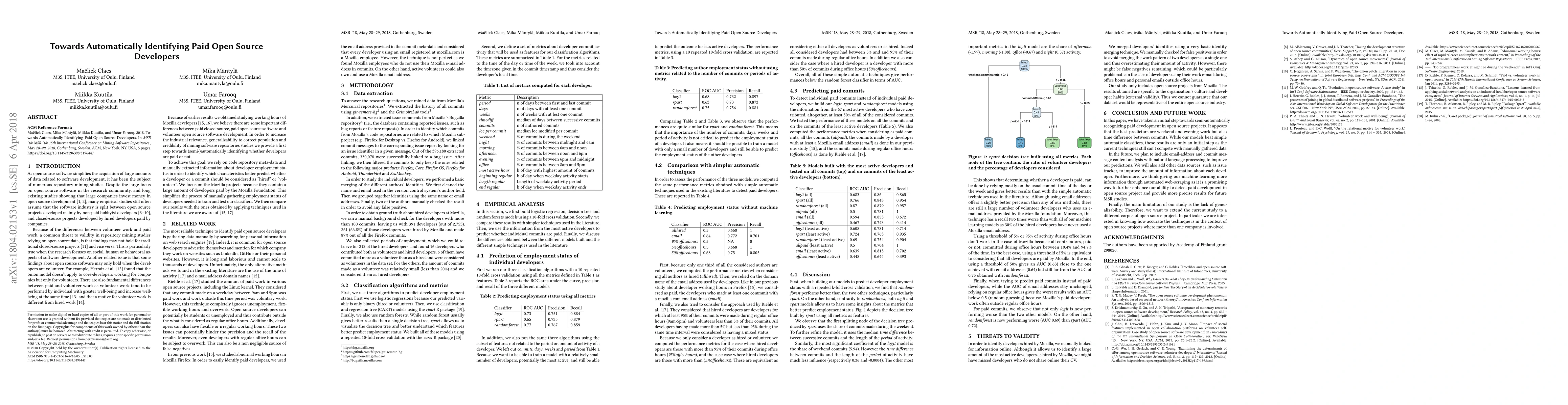 This paper explores a machine learning approach to identify paid versus volunteer open source developers using Mozilla's developer data. The study compares its results with previous automatic methods, showing improved accuracy with an AUC of 0.75 using random forest classification.