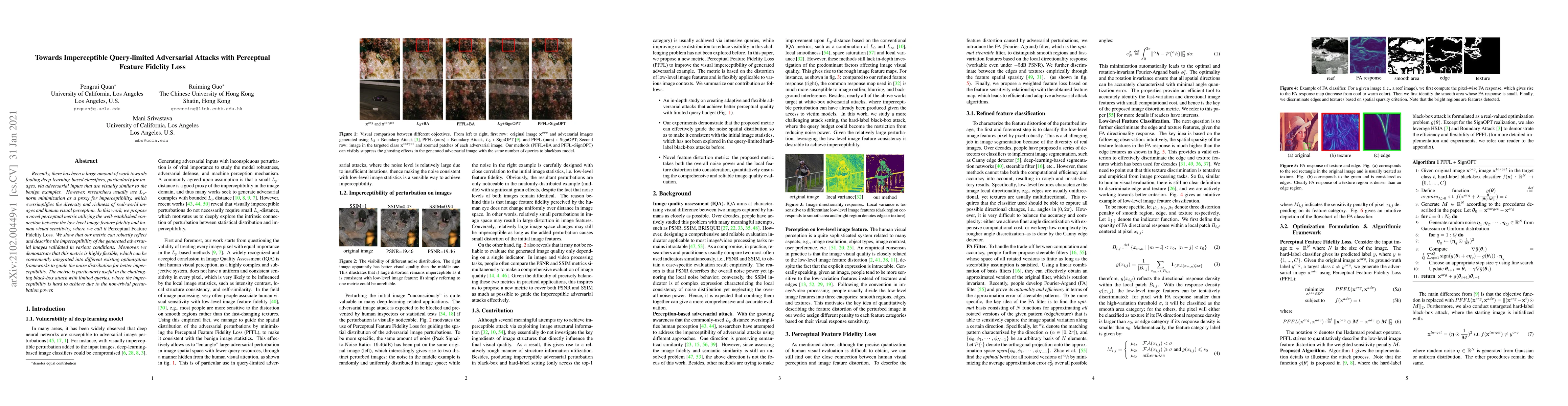 Recently, there has been a large amount of work towards fooling deep-learning-based classifiers, particularly for images, via adversarial inputs that are visually similar to the benign examples. However, researchers usually use Lp-norm minimization as a proxy for imperceptibility, which oversimplifies the diversity and richness of real-world images and human visual perception. In this work, we propose a novel perceptual metric utilizing the well-established connection between the low-level image feature fidelity and human visual sensitivity, where we call it Perceptual Feature Fidelity Loss. We show that our metric can robustly reflect and describe the imperceptibility of the generated adversarial images validated in various conditions. Moreover, we demonstrate that this metric is highly flexible, which can be conveniently integrated into different existing optimization frameworks to guide the noise distribution for better imperceptibility. The metric is particularly useful in the challenging black-box attack with limited queries, where the imperceptibility is hard to achieve due to the non-trivial perturbation power.
