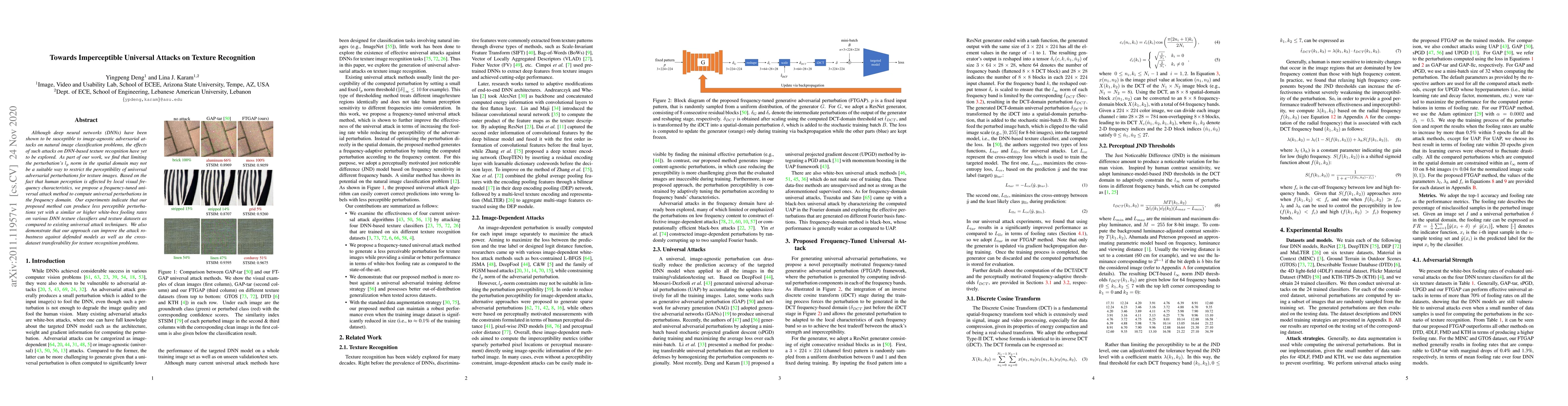 This paper explores universal adversarial attacks on deep neural network-based texture recognition systems, proposing a frequency-tuned method that produces less perceptible yet effective perturbations compared to existing techniques. The method enhances attack robustness against defended models and improves cross-dataset transferability.