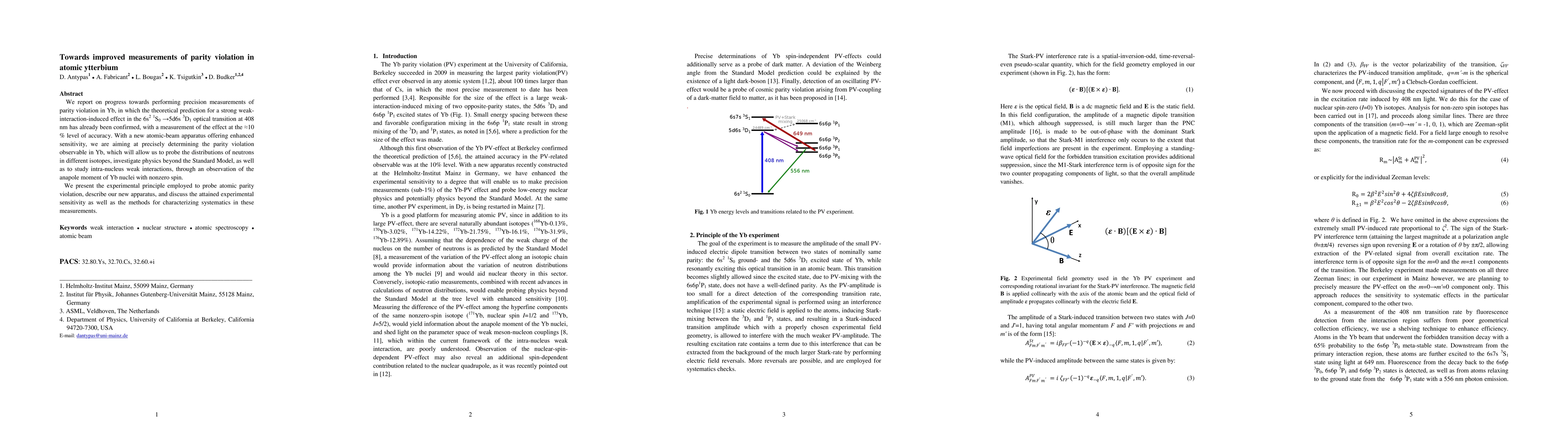 This paper reports progress in precision measurements of parity violation in atomic ytterbium, confirming a theoretical prediction with 10% accuracy. The authors aim to improve the measurement using a new apparatus to probe neutron distributions, physics beyond the Standard Model, and intra-nucleus weak interactions, including the observation of the Yb nuclei's anapole moment.