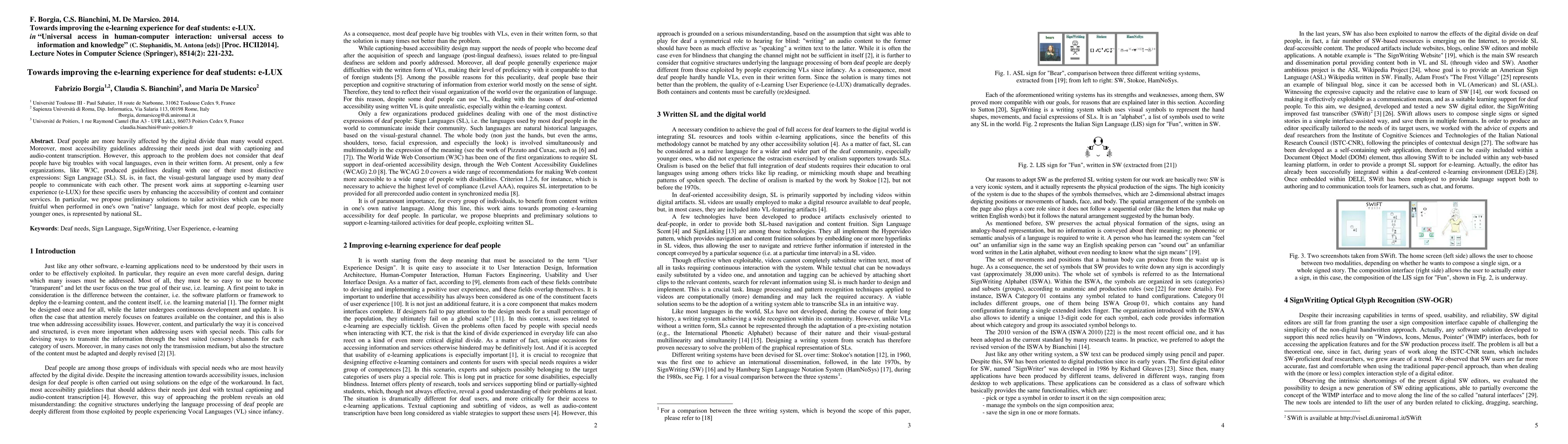 Deaf people are more heavily affected by the digital divide than many would expect. Moreover, most accessibility guidelines addressing their needs just deal with captioning and audio-content transcription. However, this approach to the problem does not consider that deaf people have big troubles with vocal languages, even in their written form. At present, only a few organizations, like W3C, produced guidelines dealing with one of their most distinctive expressions: Sign Language (SL). SL is, in fact, the visual-gestural language used by many deaf people to communicate with each other. The present work aims at supporting e-learning user experience (e-LUX) for these specific users by enhancing the accessibility of content and container services. In particular, we propose preliminary solutions to tailor activities which can be more fruitful when performed in one's own "native" language, which for most deaf people, especially younger ones, is represented by national SL.
