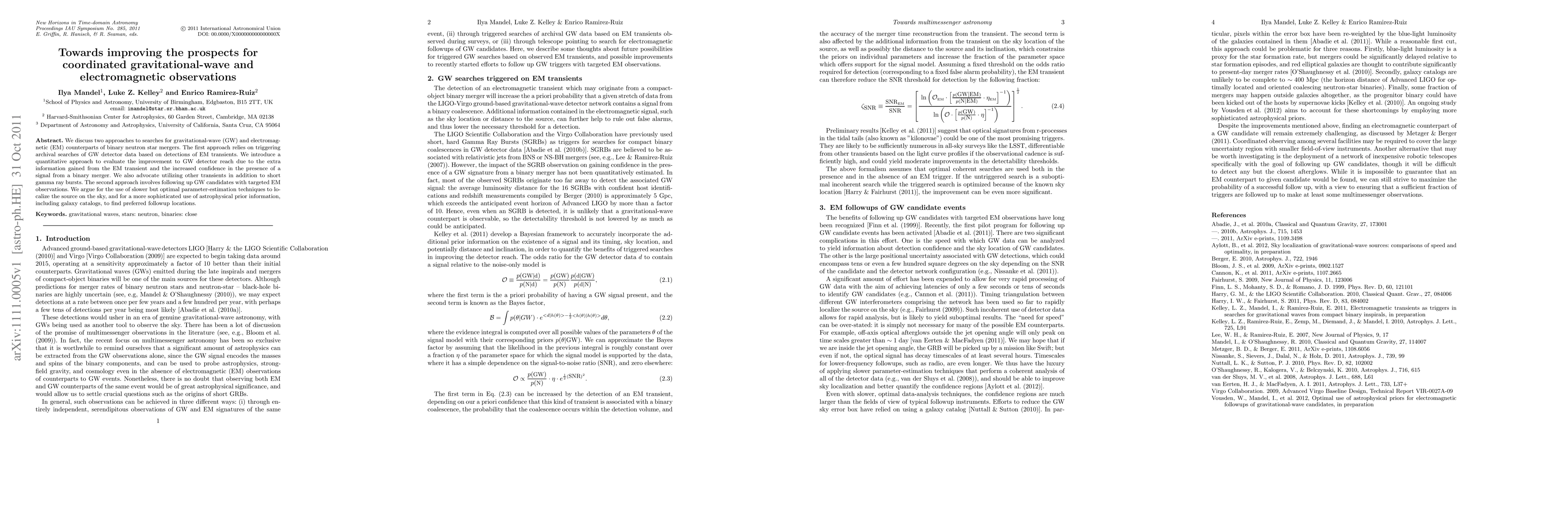 We discuss two approaches to searches for gravitational-wave (GW) and electromagnetic (EM) counterparts of binary neutron star mergers. The first approach relies on triggering archival searches of GW detector data based on detections of EM transients. We introduce a quantitative approach to evaluate the improvement to GW detector reach due to the extra information gained from the EM transient and the increased confidence in the presence of a signal from a binary merger. We also advocate utilizing other transients in addition to short gamma ray bursts. The second approach involves following up GW candidates with targeted EM observations. We argue for the use of slower but optimal parameter-estimation techniques to localize the source on the sky, and for a more sophisticated use of astrophysical prior information, including galaxy catalogs, to find preferred followup locations.