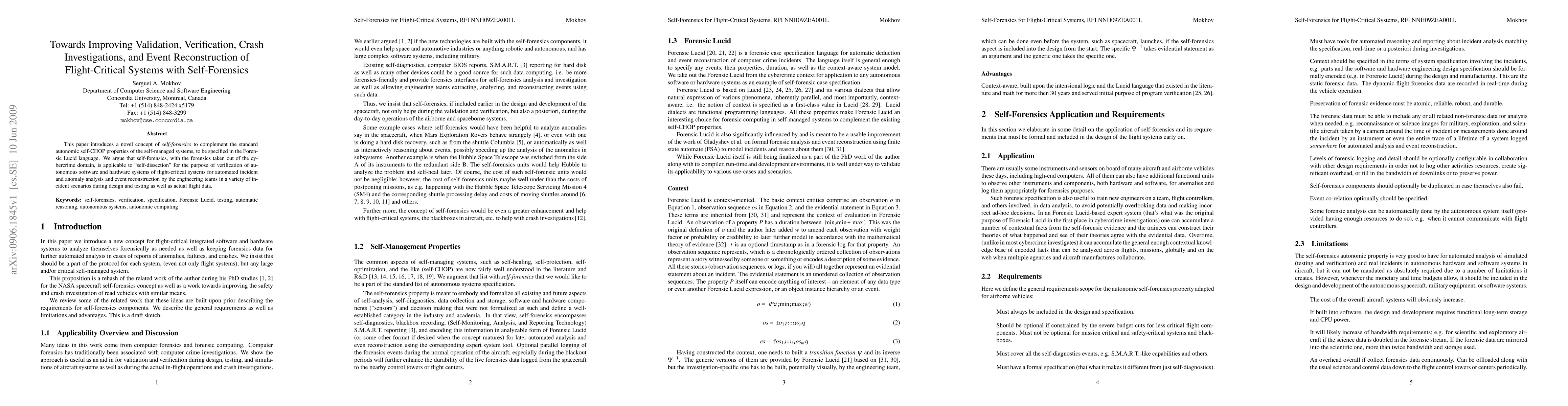 This paper introduces a novel concept of self-forensics to complement the standard autonomic self-CHOP properties of the self-managed systems, to be specified in the Forensic Lucid language. We argue that self-forensics, with the forensics taken out of the cybercrime domain, is applicable to "self-dissection" for the purpose of verification of autonomous software and hardware systems of flight-critical systems for automated incident and anomaly analysis and event reconstruction by the engineering teams in a variety of incident scenarios during design and testing as well as actual flight data.