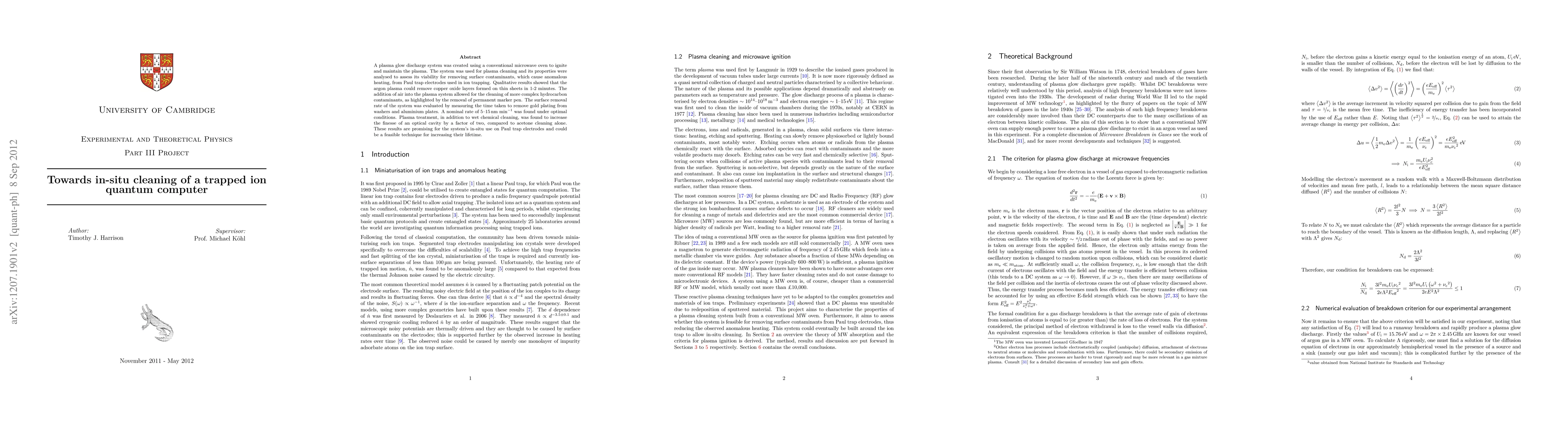 This paper details the development of a plasma glow discharge system for cleaning trapped ion quantum computer electrodes, showing effective removal of contaminants like copper oxide and hydrocarbons, with a surface removal rate of 5-15 nm per minute. The system's integration with wet chemical cleaning doubled the finesse of an optical cavity, suggesting potential for extending the lifetime of Paul trap electrodes.