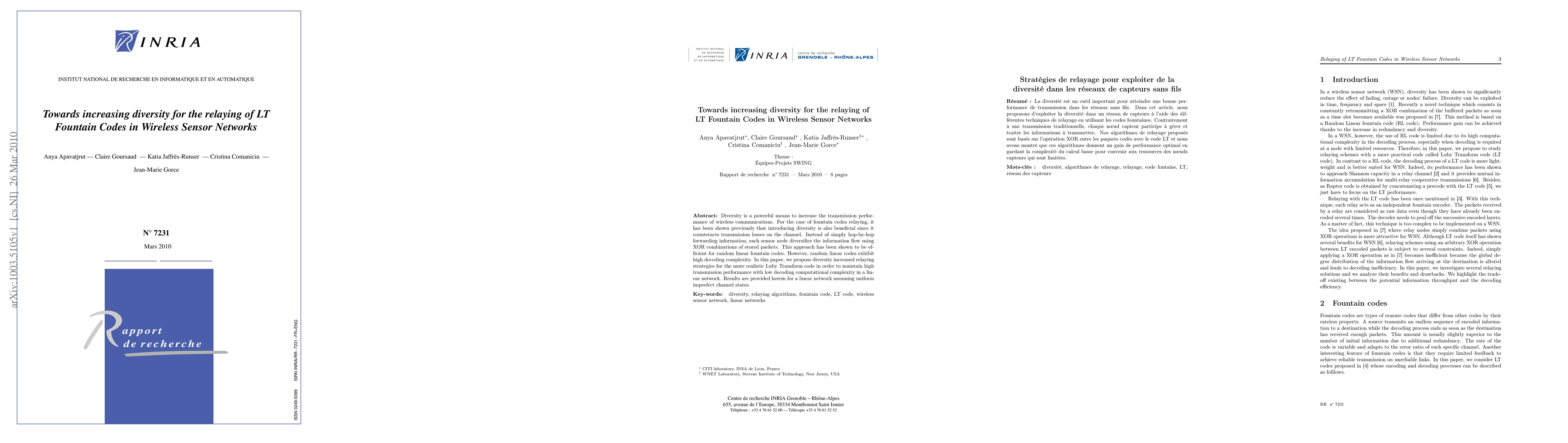 This paper proposes enhanced relaying strategies for Luby Transform (LT) Fountain Codes in wireless sensor networks to improve transmission performance while maintaining low decoding complexity. It introduces diversity through XOR combinations of stored packets, aiming to counteract channel losses and achieve efficient performance in linear networks under imperfect channel conditions.