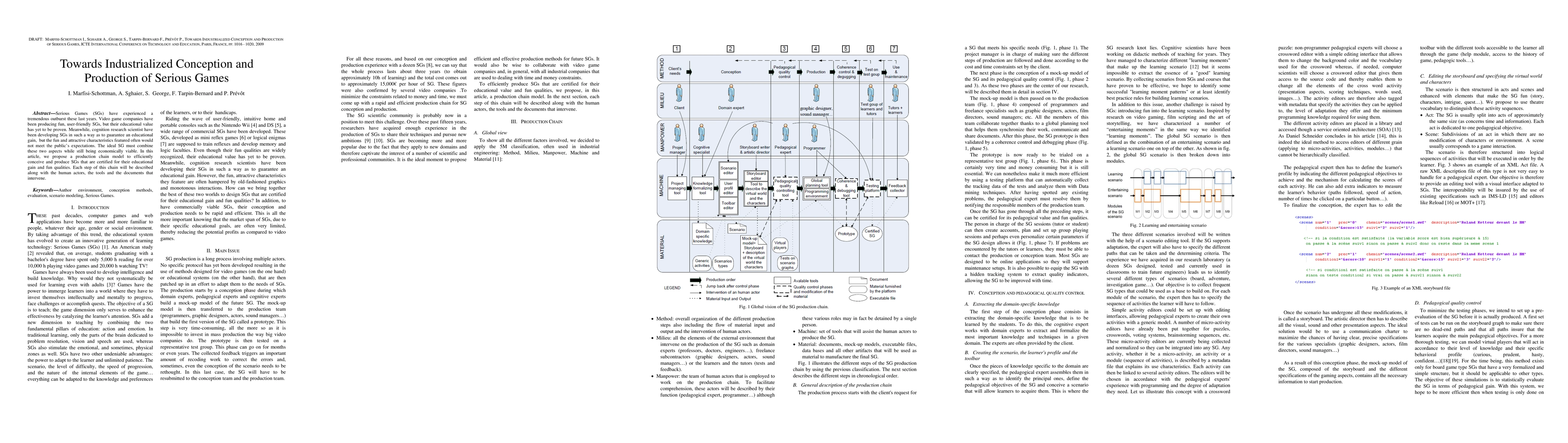 Serious Games (SGs) have experienced a tremendous outburst these last years. Video game companies have been producing fun, user-friendly SGs, but their educational value has yet to be proven. Meanwhile, cognition research scientist have been developing SGs in such a way as to guarantee an educational gain, but the fun and attractive characteristics featured often would not meet the public's expectations. The ideal SG must combine these two aspects while still being economically viable. In this article, we propose a production chain model to efficiently conceive and produce SGs that are certified for their educational gain and fun qualities. Each step of this chain will be described along with the human actors, the tools and the documents that intervene.