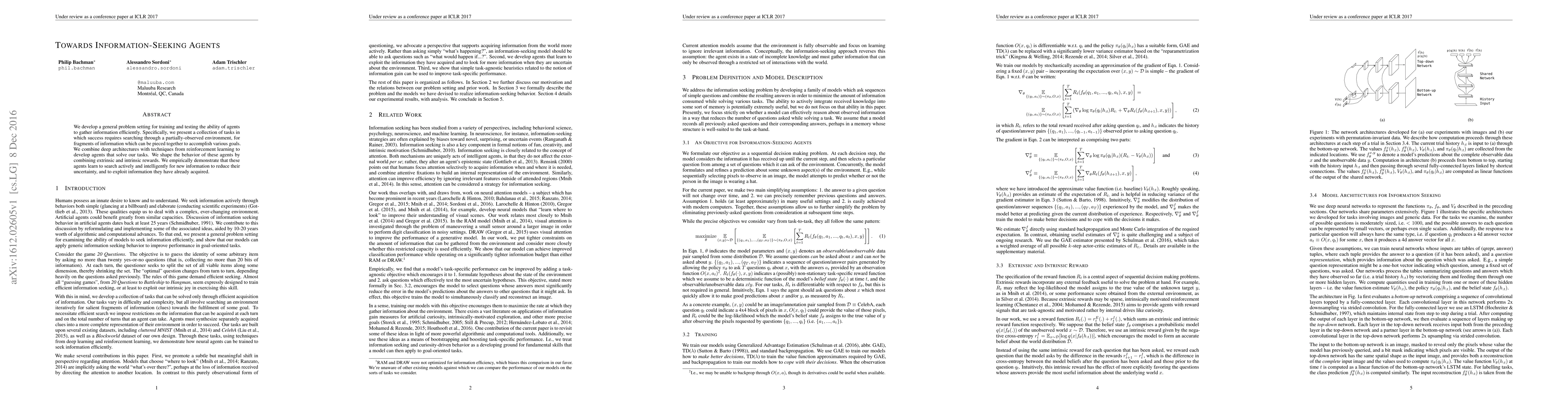 The paper develops a problem setting for training agents to efficiently gather information by searching through partially-observed environments and piecing together fragments of information to accomplish goals. It combines deep architectures with reinforcement learning techniques, using extrinsic and intrinsic rewards to shape agent behavior.