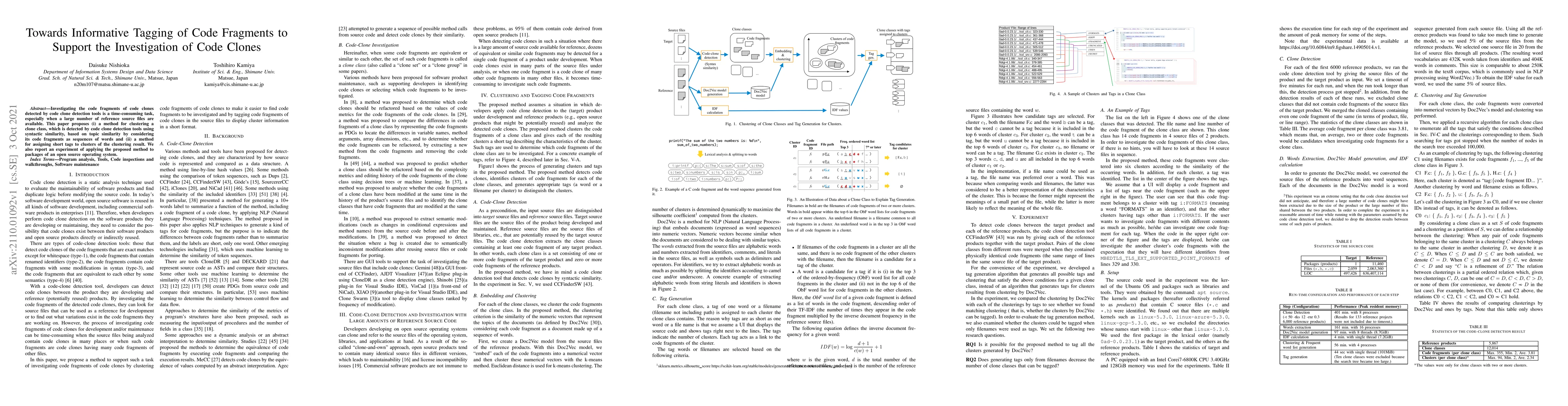 This paper proposes a method for clustering code clones based on topic similarity and assigns informative tags to the clusters to facilitate investigation. An experiment on an open source operating system demonstrates the effectiveness of the proposed approach.
