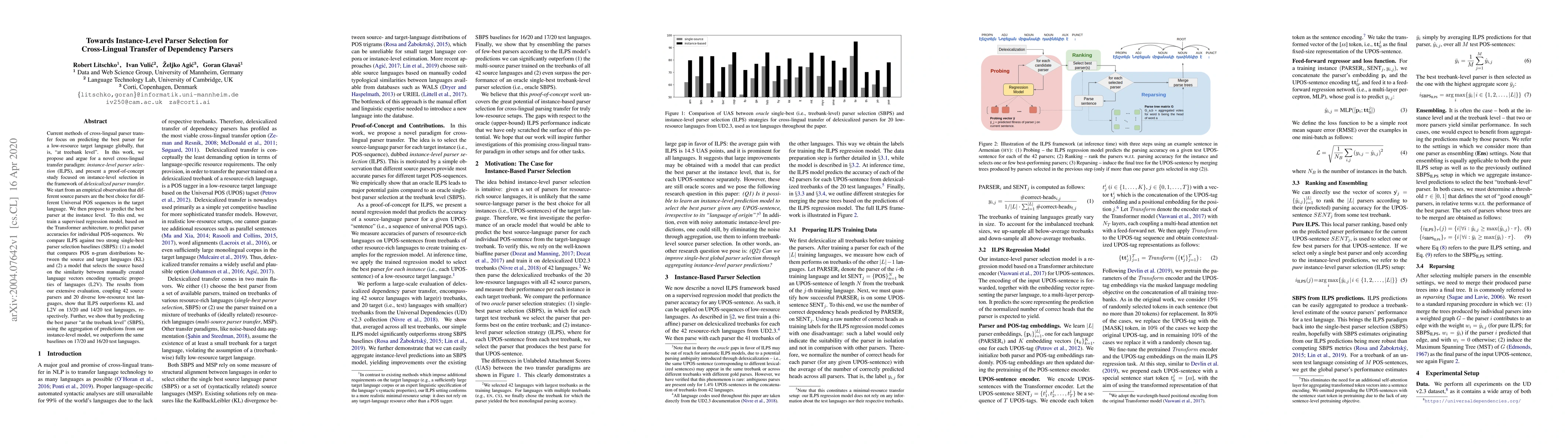 This paper proposes instance-level parser selection (ILPS) for cross-lingual transfer of dependency parsers, outperforming single-best parser selection baselines by predicting the best parser for individual Universal POS sequences, and achieving better results on multiple low-resource languages.