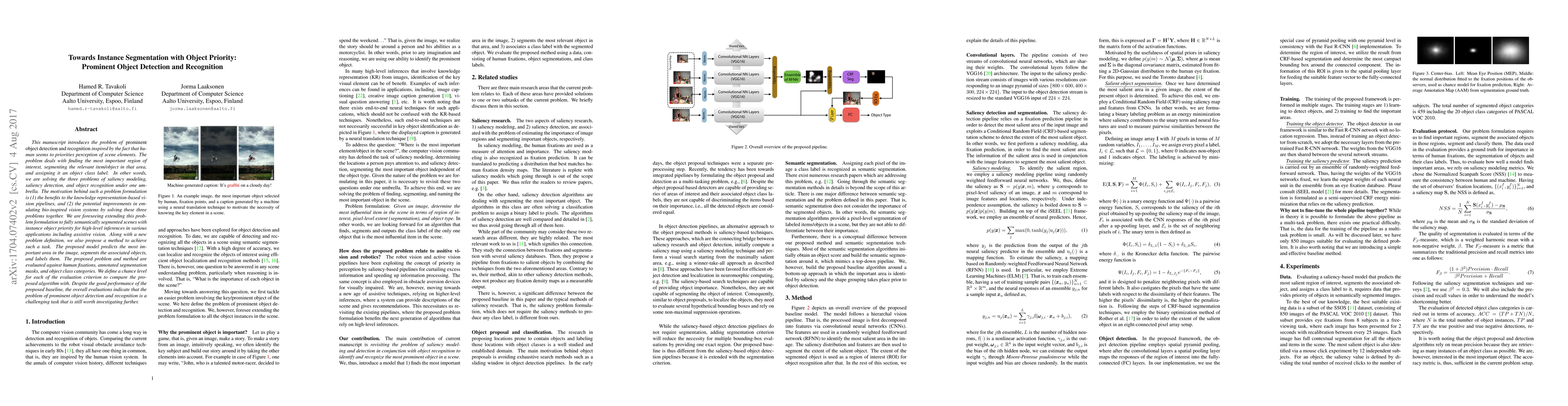 This manuscript introduces the problem of prominent object detection and recognition inspired by the fact that human seems to priorities perception of scene elements. The problem deals with finding the most important region of interest, segmenting the relevant item/object in that area, and assigning it an object class label. In other words, we are solving the three problems of saliency modeling, saliency detection, and object recognition under one umbrella. The motivation behind such a problem formulation is (1) the benefits to the knowledge representation-based vision pipelines, and (2) the potential improvements in emulating bio-inspired vision systems by solving these three problems together. We are foreseeing extending this problem formulation to fully semantically segmented scenes with instance object priority for high-level inferences in various applications including assistive vision. Along with a new problem definition, we also propose a method to achieve such a task. The proposed model predicts the most important area in the image, segments the associated objects, and labels them. The proposed problem and method are evaluated against human fixations, annotated segmentation masks, and object class categories. We define a chance level for each of the evaluation criterion to compare the proposed algorithm with. Despite the good performance of the proposed baseline, the overall evaluations indicate that the problem of prominent object detection and recognition is a challenging task that is still worth investigating further.