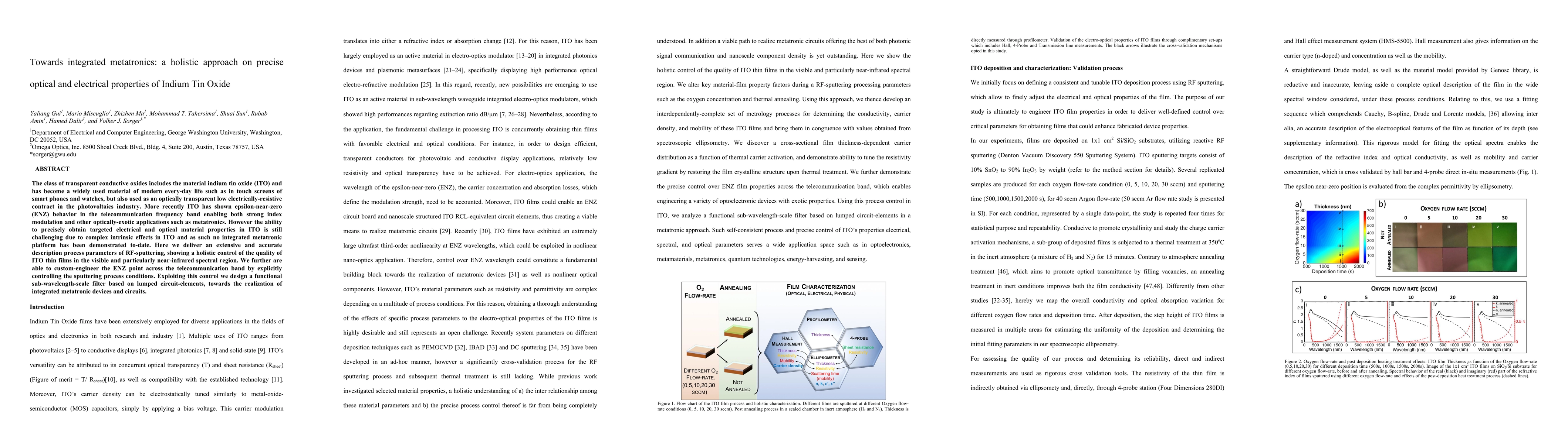 The class of transparent conductive oxides includes the material indium tin oxide (ITO) and has become a widely used material of modern every-day life such as in touch screens of smart phones and watches, but also used as an optically transparent low electrically-resistive contract in the photovoltaics industry. More recently ITO has shown epsilon-near-zero (ENZ) behavior in the telecommunication frequency band enabling both strong index modulation and other optically-exotic applications such as metatronics. However the ability to precisely obtain targeted electrical and optical material properties in ITO is still challenging due to complex intrinsic effects in ITO and as such no integrated metatronic platform has been demonstrated to-date. Here we deliver an extensive and accurate description process parameters of RF-sputtering, showing a holistic control of the quality of ITO thin films in the visible and particularly near-infrared spectral region. We further are able to custom-engineer the ENZ point across the telecommunication band by explicitly controlling the sputtering process conditions. Exploiting this control we design a functional sub-wavelength-scale filter based on lumped circuit-elements, towards the realization of integrated metatronic devices and circuits.