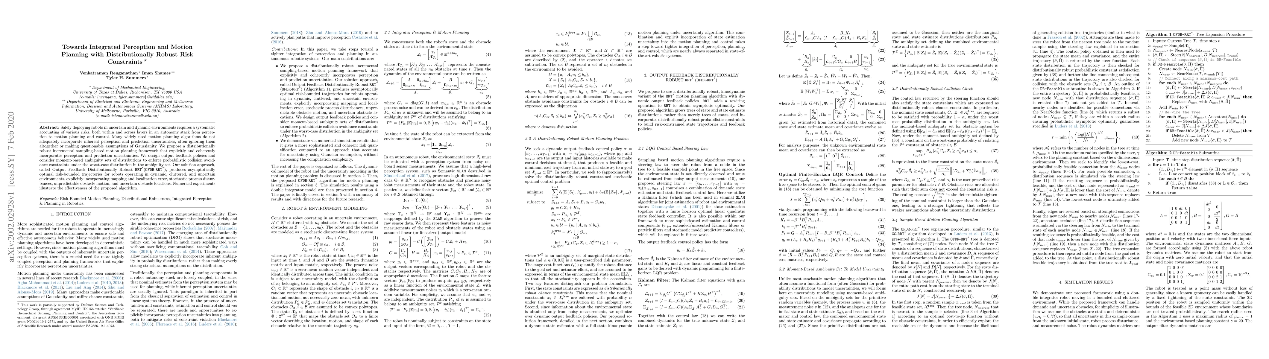 The paper proposes a distributionally robust incremental sampling-based motion planning framework that integrates perception and prediction uncertainties, using output feedback policies and moment-based ambiguity sets for probabilistic collision avoidance constraints.