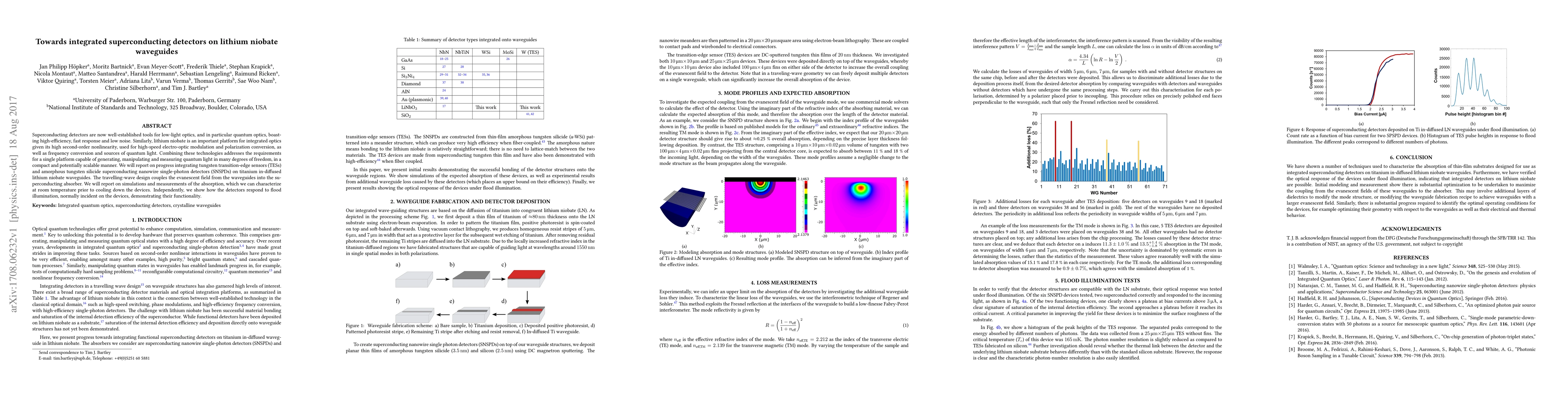 Superconducting detectors are now well-established tools for low-light optics, and in particular quantum optics, boasting high-efficiency, fast response and low noise. Similarly, lithium niobate is an important platform for integrated optics given its high second-order nonlinearity, used for high-speed electro-optic modulation and polarization conversion, as well as frequency conversion and sources of quantum light. Combining these technologies addresses the requirements for a single platform capable of generating, manipulating and measuring quantum light in many degrees of freedom, in a compact and potentially scalable manner. We will report on progress integrating tungsten transition-edge sensors (TESs) and amorphous tungsten silicide superconducting nanowire single-photon detectors (SNSPDs) on titanium in-diffused lithium niobate waveguides. The travelling-wave design couples the evanescent field from the waveguides into the superconducting absorber. We will report on simulations and measurements of the absorption, which we can characterize at room temperature prior to cooling down the devices. Independently, we show how the detectors respond to flood illumination, normally incident on the devices, demonstrating their functionality.