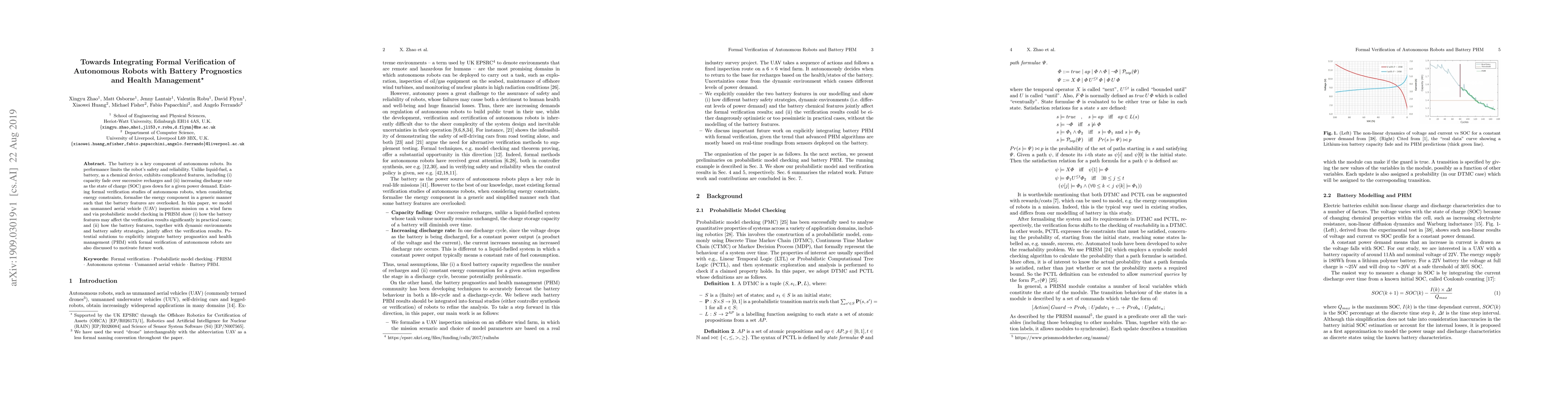 This paper investigates the integration of formal verification for autonomous robots with battery prognostics and health management, demonstrating through a UAV inspection mission that battery features significantly impact verification outcomes. The study proposes potential solutions for explicitly incorporating battery health strategies into formal verification processes.