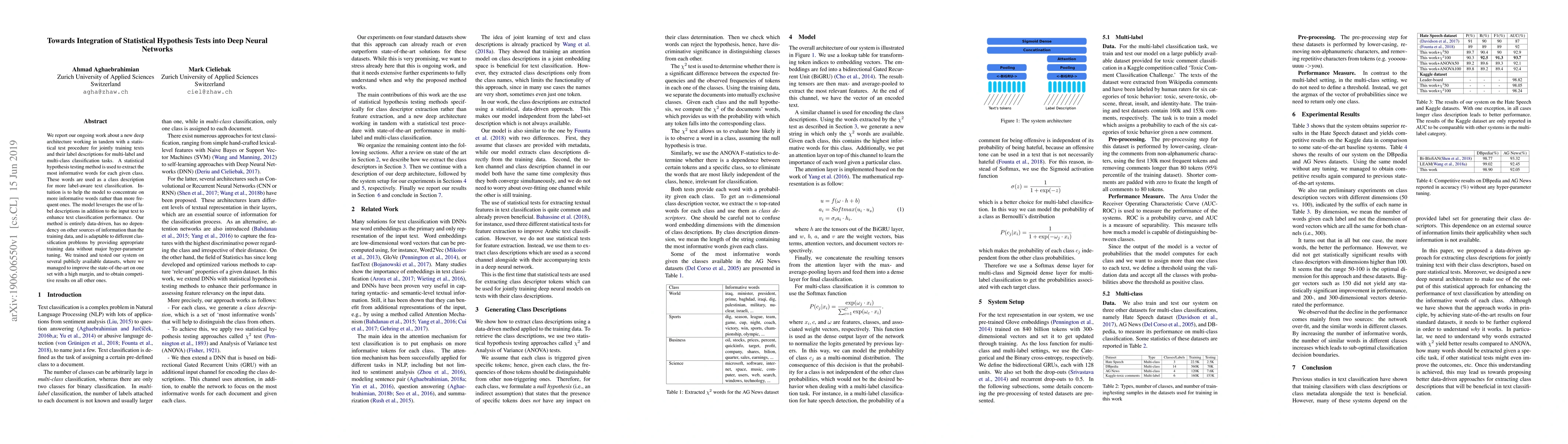 This research paper proposes a new approach to deep neural networks that combines statistical hypothesis testing with text classification, improving performance on multi-label and multi-class tasks. By leveraging label descriptions, the model extracts informative words for each class, leading to enhanced text classification accuracy.
