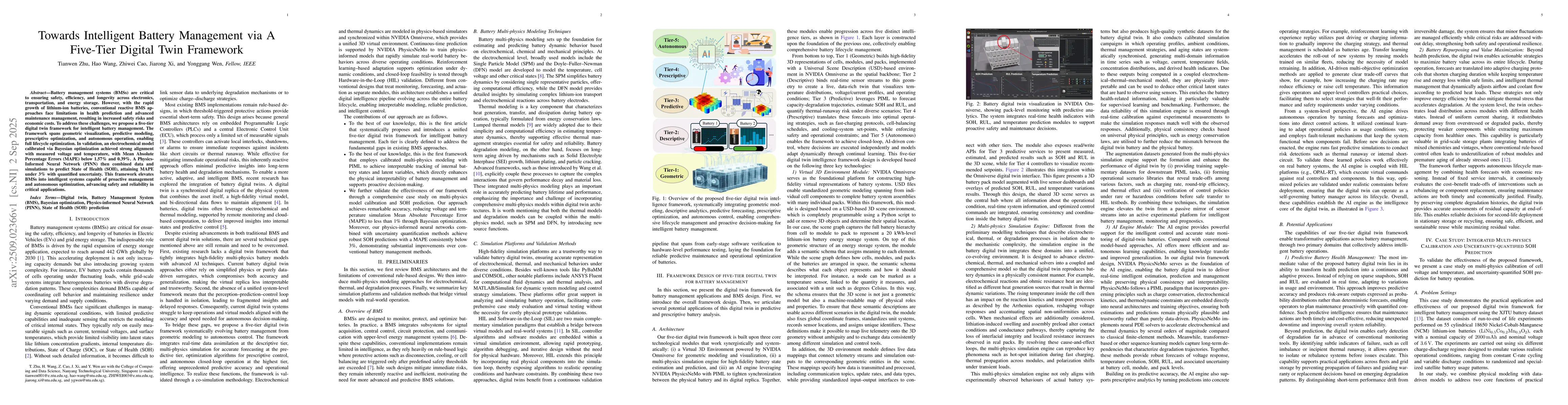 Battery management systems (BMSs) are critical to ensuring safety, efficiency, and longevity across electronics, transportation, and energy storage. However, with the rapid growth of lithium-ion batteries, conventional reactive BMS approaches face limitations in health prediction and advanced maintenance management, resulting in increased safety risks and economic costs. To address these challenges, we propose a five-tier digital twin framework for intelligent battery management. The framework spans geometric visualization, predictive modeling, prescriptive optimization, and autonomous operation, enabling full lifecycle optimization. In validation, an electrochemical model calibrated via Bayesian optimization achieved strong alignment with measured voltage and temperature, with Mean Absolute Percentage Errors (MAPE) below 1.57\% and 0.39\%. A Physics-Informed Neural Network (PINN) then combined data and simulations to predict State of Health (SOH), attaining MAPE under 3\% with quantified uncertainty. This framework elevates BMSs into intelligent systems capable of proactive management and autonomous optimization, advancing safety and reliability in critical applications.