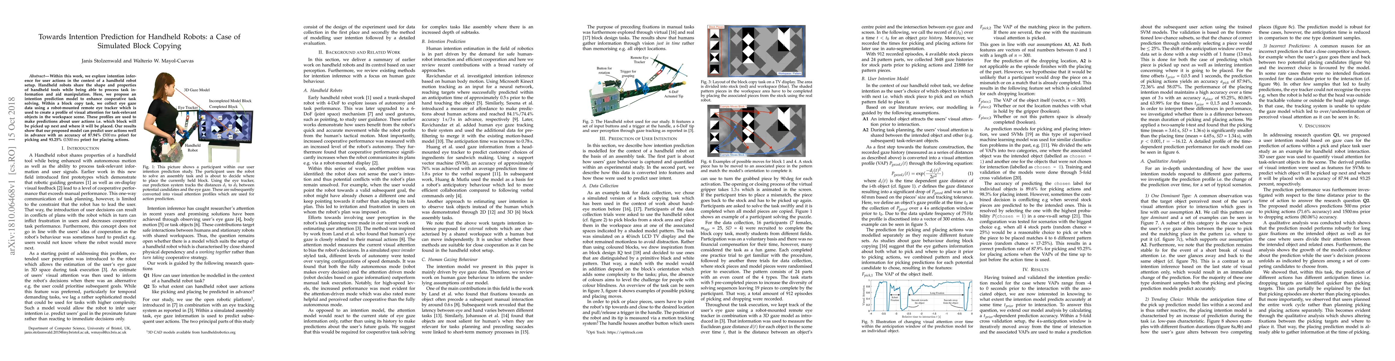 Within this work, we explore intention inference for user actions in the context of a handheld robot setup. Handheld robots share the shape and properties of handheld tools while being able to process task information and aid manipulation. Here, we propose an intention prediction model to enhance cooperative task solving. Within a block copy task, we collect eye gaze data using a robot-mounted remote eye tracker which is used to create a profile of visual attention for task-relevant objects in the workspace scene. These profiles are used to make predictions about user actions i.e. which block will be picked up next and where it will be placed. Our results show that our proposed model can predict user actions well in advance with an accuracy of 87.94% (500ms prior) for picking and 93.25% (1500 ms prior) for placing actions.