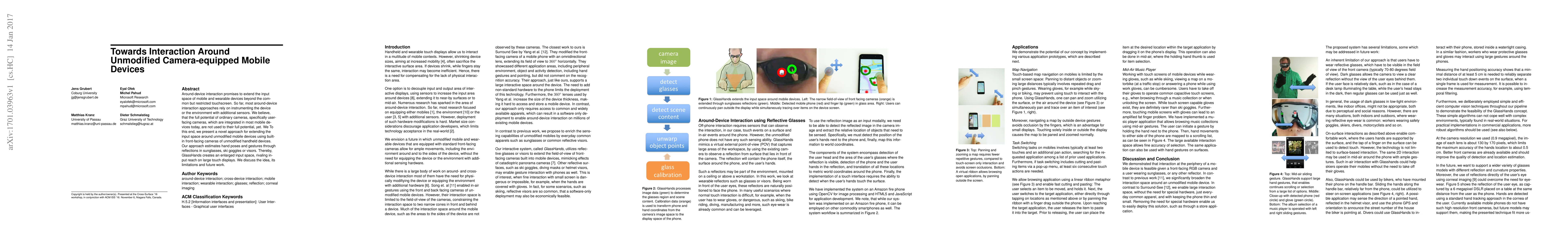 Around-device interaction promises to extend the input space of mobile and wearable devices beyond the common but restricted touchscreen. So far, most around-device interaction approaches rely on instrumenting the device or the environment with additional sensors. We believe, that the full potential of ordinary cameras, specifically user-facing cameras, which are integrated in most mobile devices today, are not used to their full potential, yet. We To this end, we present a novel approach for extending the input space around unmodified mobile devices using built-in front-facing cameras of unmodified handheld devices. Our approach estimates hand poses and gestures through reflections in sunglasses, ski goggles or visors. Thereby, GlassHands creates an enlarged input space, rivaling input reach on large touch displays. We discuss the idea, its limitations and future work.