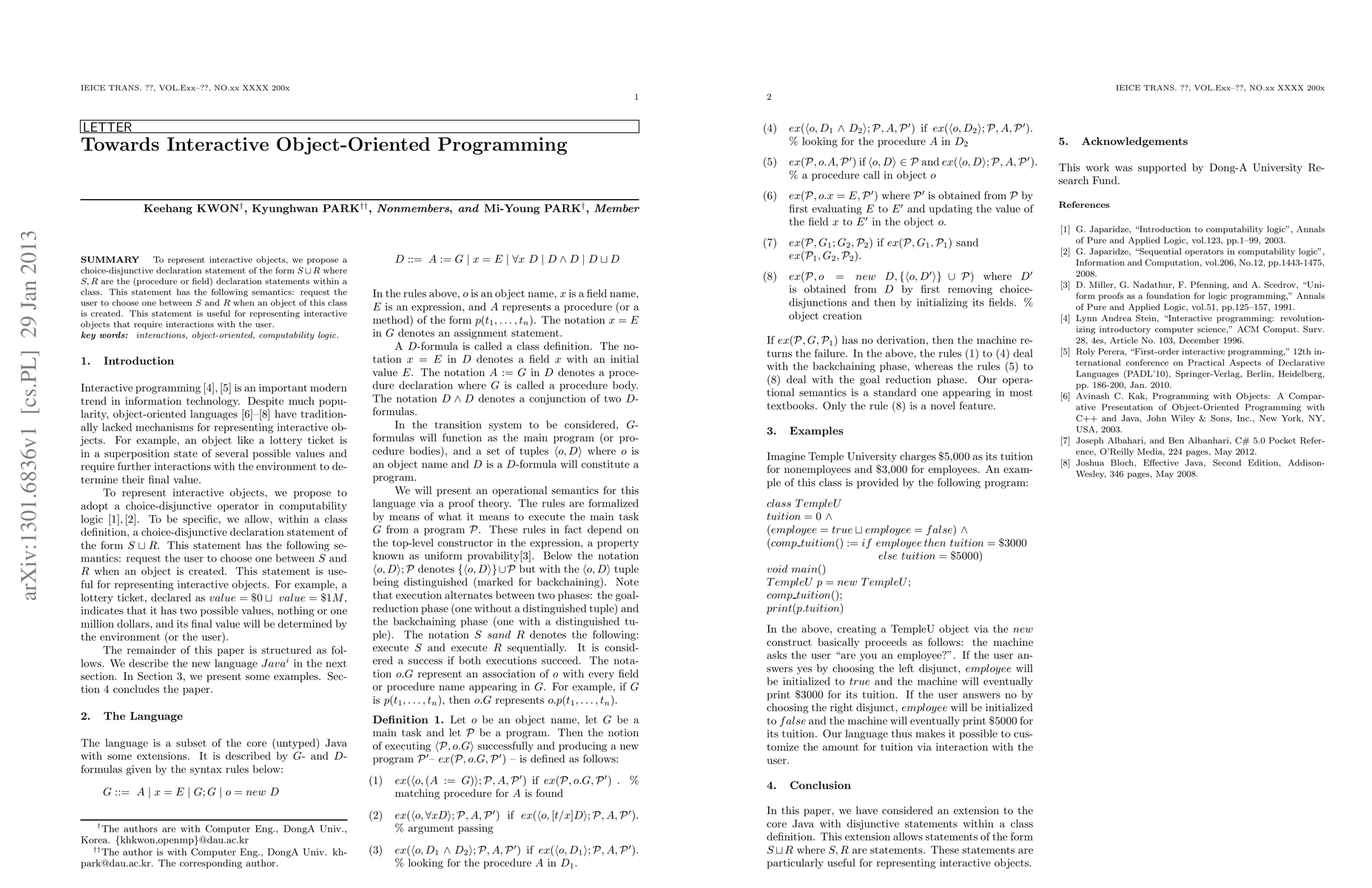 To represent interactive objects, we propose a choice-disjunctive declaration statement of the form S R where S;R are the (procedure or field) declaration statements within a class. This statement has the following semantics: request the user to choose one between S and R when an object of this class is created. This statement is useful for representing interactive objects that require interactions with the user.