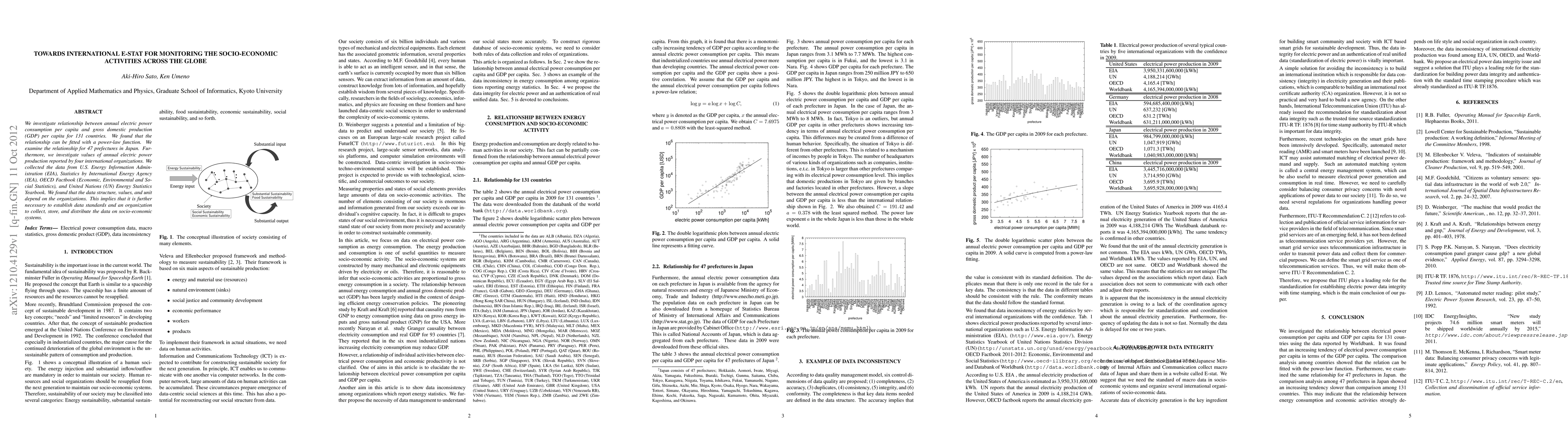 We investigate relationship between annual electric power consumption per capita and gross domestic production (GDP) per capita for 131 countries. We found that the relationship can be fitted with a power-law function. We examine the relationship for 47 prefectures in Japan. Furthermore, we investigate values of annual electric power production reported by four international organizations. We collected the data from U.S. Energy Information Administration (EIA), Statistics by International Energy Agency (IEA), OECD Factbook (Economic, Environmental and Social Statistics), and United Nations (UN) Energy Statistics Yearbook. We found that the data structure, values, and unit depend on the organizations. This implies that it is further necessary to establish data standards and an organization to collect, store, and distribute the data on socio-economic systems.