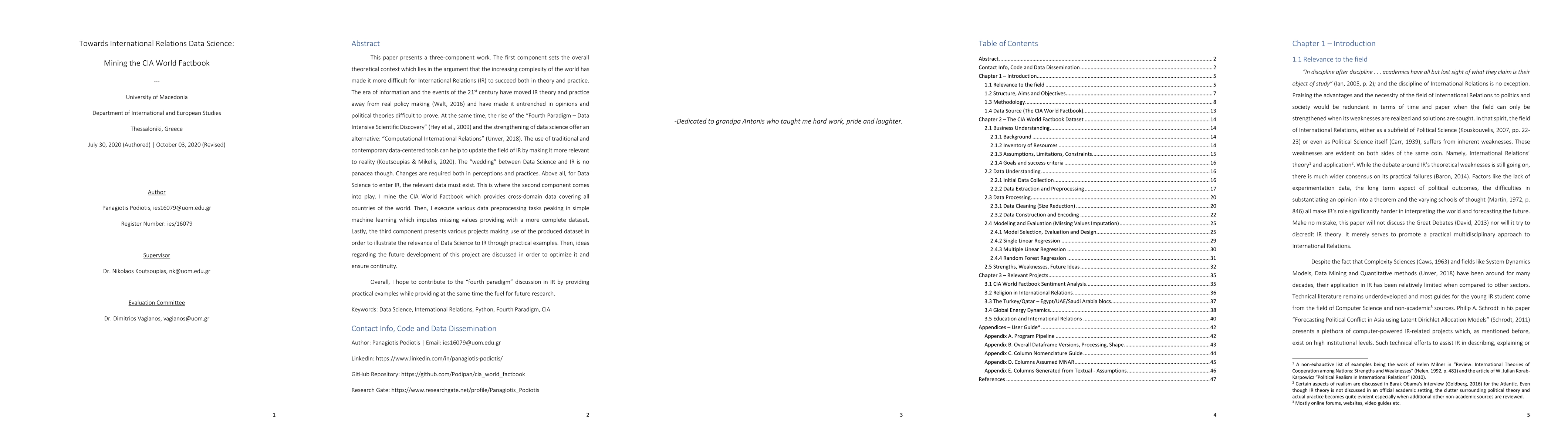 This paper presents a three-component work. The first component sets the overall theoretical context which lies in the argument that the increasing complexity of the world has made it more difficult for International Relations (IR) to succeed both in theory and practice. The era of information and the events of the 21st century have moved IR theory and practice away from real policy making (Walt, 2016) and have made it entrenched in opinions and political theories difficult to prove. At the same time, the rise of the "Fourth Paradigm - Data Intensive Scientific Discovery" (Hey et al., 2009) and the strengthening of data science offer an alternative: "Computational International Relations" (Unver, 2018). The use of traditional and contemporary data-centered tools can help to update the field of IR by making it more relevant to reality (Koutsoupias, Mikelis, 2020). The "wedding" between Data Science and IR is no panacea though. Changes are required both in perceptions and practices. Above all, for Data Science to enter IR, the relevant data must exist. This is where the second component comes into play. I mine the CIA World Factbook which provides cross-domain data covering all countries of the world. Then, I execute various data preprocessing tasks peaking in simple machine learning which imputes missing values providing with a more complete dataset. Lastly, the third component presents various projects making use of the produced dataset in order to illustrate the relevance of Data Science to IR through practical examples. Then, ideas regarding the future development of this project are discussed in order to optimize it and ensure continuity. Overall, I hope to contribute to the "fourth paradigm" discussion in IR by providing practical examples while providing at the same time the fuel for future research.