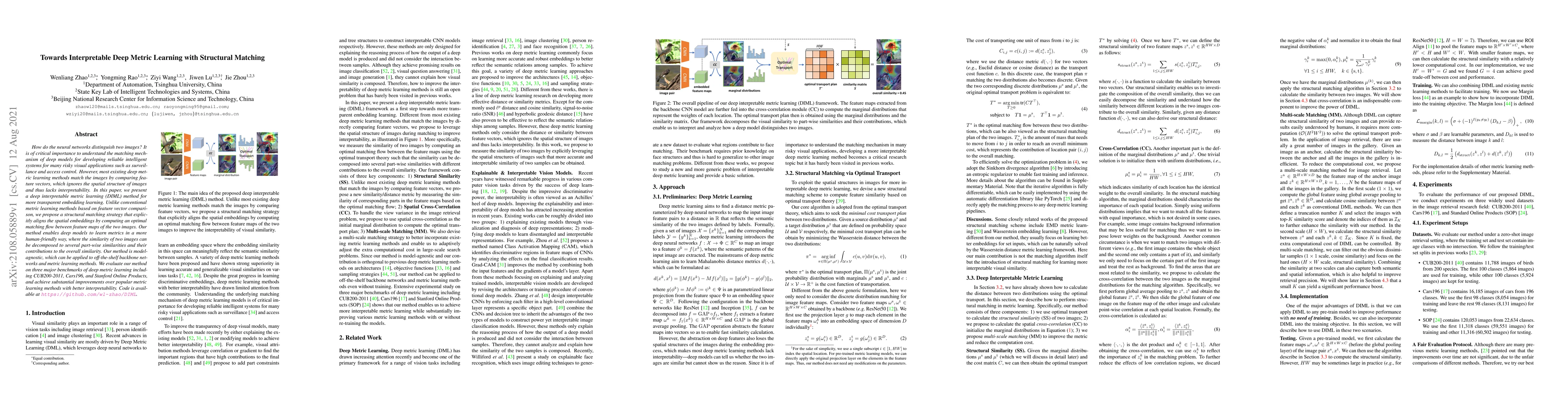 How do the neural networks distinguish two images? It is of critical importance to understand the matching mechanism of deep models for developing reliable intelligent systems for many risky visual applications such as surveillance and access control. However, most existing deep metric learning methods match the images by comparing feature vectors, which ignores the spatial structure of images and thus lacks interpretability. In this paper, we present a deep interpretable metric learning (DIML) method for more transparent embedding learning. Unlike conventional metric learning methods based on feature vector comparison, we propose a structural matching strategy that explicitly aligns the spatial embeddings by computing an optimal matching flow between feature maps of the two images. Our method enables deep models to learn metrics in a more human-friendly way, where the similarity of two images can be decomposed to several part-wise similarities and their contributions to the overall similarity. Our method is model-agnostic, which can be applied to off-the-shelf backbone networks and metric learning methods. We evaluate our method on three major benchmarks of deep metric learning including CUB200-2011, Cars196, and Stanford Online Products, and achieve substantial improvements over popular metric learning methods with better interpretability. Code is available at https://github.com/wl-zhao/DIML