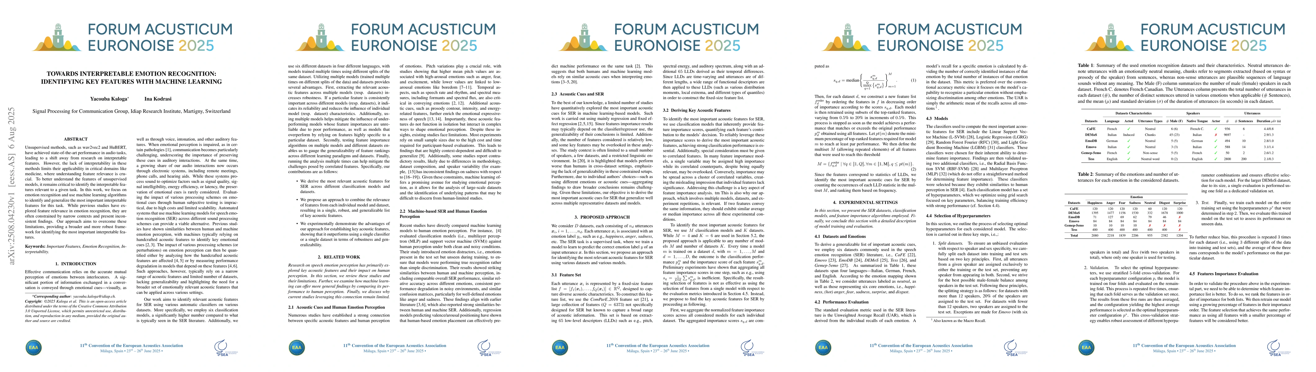 Unsupervised methods, such as wav2vec2 and HuBERT, have achieved state-of-the-art performance in audio tasks, leading to a shift away from research on interpretable features. However, the lack of interpretability in these methods limits their applicability in critical domains like medicine, where understanding feature relevance is crucial. To better understand the features of unsupervised models, it remains critical to identify the interpretable features relevant to a given task. In this work, we focus on emotion recognition and use machine learning algorithms to identify and generalize the most important interpretable features for this task. While previous studies have explored feature relevance in emotion recognition, they are often constrained by narrow contexts and present inconsistent findings. Our approach aims to overcome these limitations, providing a broader and more robust framework for identifying the most important interpretable features.