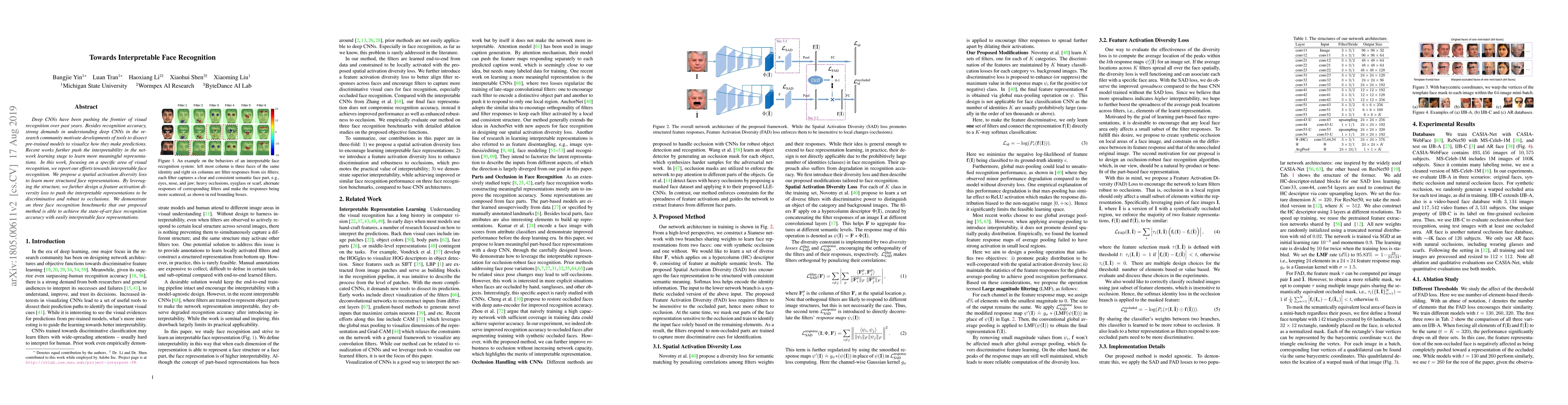 This paper proposes a method to enhance interpretability in face recognition using deep CNNs by introducing spatial and feature activation diversity losses. The approach aims to learn structured and discriminative representations, improving face recognition accuracy while maintaining interpretability.