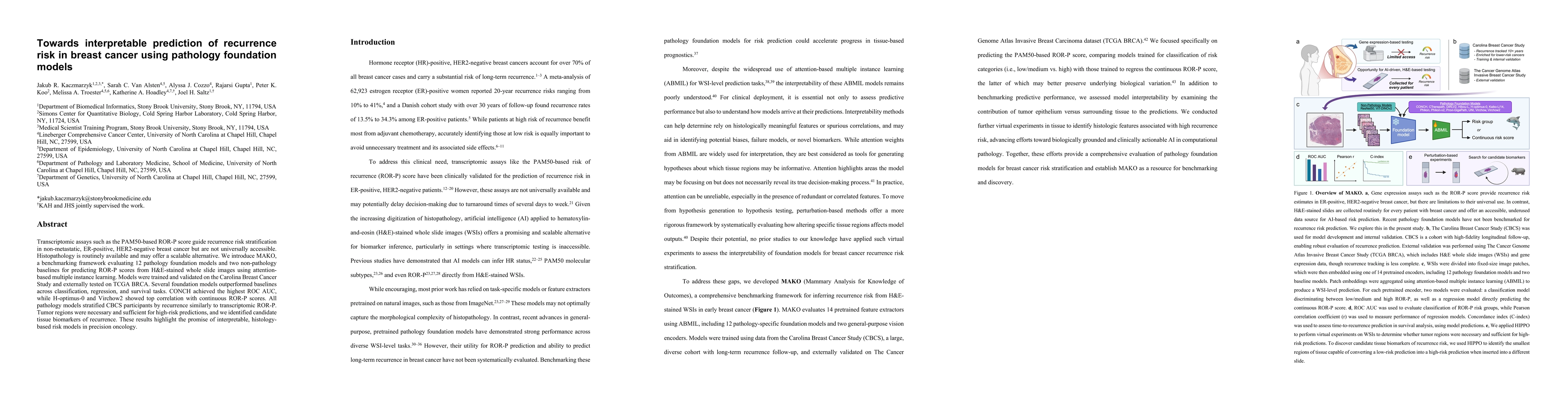 This study introduced MAKO, a benchmarking framework evaluating 12 pathology foundation models and two non-pathology baselines for predicting ROR-P scores from H&E-stained whole slide images using attention-based multiple instance learning. Models were trained and validated on the Carolina Breast Cancer Study and externally tested on TCGA BRCA.