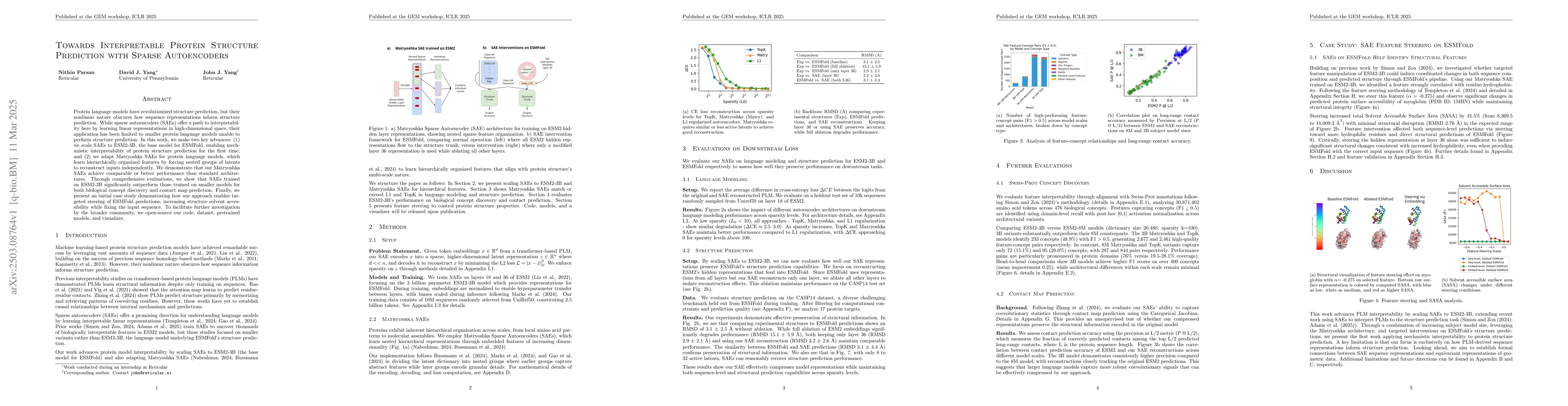 This paper scales sparse autoencoders (SAEs) to ESM2-3B for interpretable protein structure prediction, introducing Matryoshka SAEs for hierarchical feature learning. The authors demonstrate improved performance and biological concept discovery, and open-source their tools to advance community research.