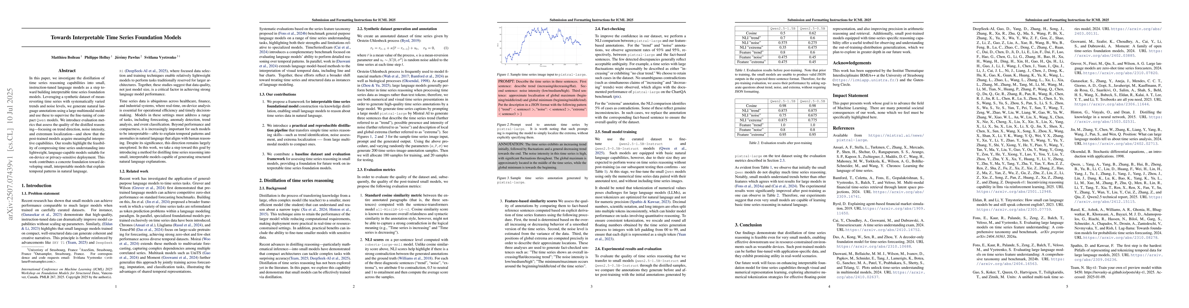In this paper, we investigate the distillation of time series reasoning capabilities into small, instruction-tuned language models as a step toward building interpretable time series foundation models. Leveraging a synthetic dataset of mean-reverting time series with systematically varied trends and noise levels, we generate natural language annotations using a large multimodal model and use these to supervise the fine-tuning of compact Qwen models. We introduce evaluation metrics that assess the quality of the distilled reasoning - focusing on trend direction, noise intensity, and extremum localization - and show that the post-trained models acquire meaningful interpretive capabilities. Our results highlight the feasibility of compressing time series understanding into lightweight, language-capable models suitable for on-device or privacy-sensitive deployment. This work contributes a concrete foundation toward developing small, interpretable models that explain temporal patterns in natural language.