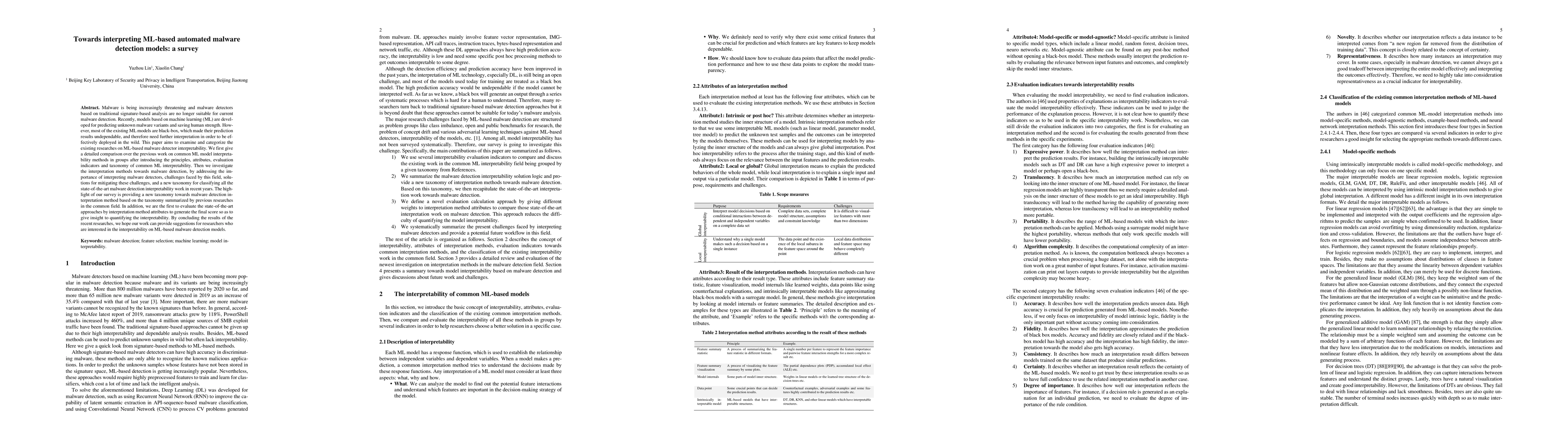 This paper surveys interpretability methods for ML-based malware detection models, highlighting the shift from traditional signature-based analysis to ML approaches. It categorizes existing research, evaluates state-of-the-art methods, and proposes a new taxonomy for classifying interpretability techniques, aiming to guide future research in making these models more transparent and reliable.