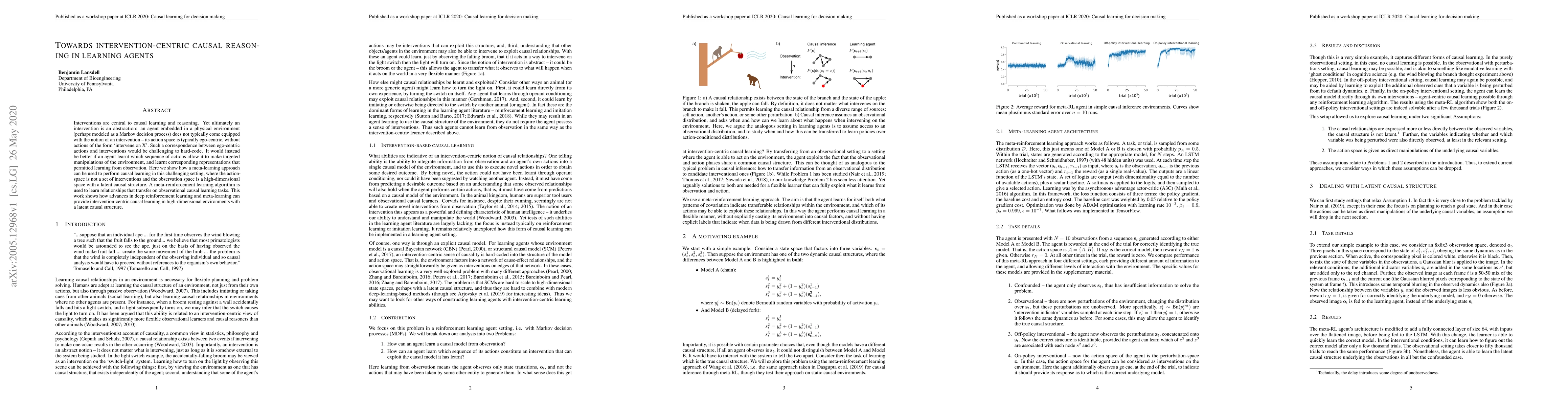 Interventions are central to causal learning and reasoning. Yet ultimately an intervention is an abstraction: an agent embedded in a physical environment (perhaps modeled as a Markov decision process) does not typically come equipped with the notion of an intervention -- its action space is typically ego-centric, without actions of the form `intervene on X'. Such a correspondence between ego-centric actions and interventions would be challenging to hard-code. It would instead be better if an agent learnt which sequence of actions allow it to make targeted manipulations of the environment, and learnt corresponding representations that permitted learning from observation. Here we show how a meta-learning approach can be used to perform causal learning in this challenging setting, where the action-space is not a set of interventions and the observation space is a high-dimensional space with a latent causal structure. A meta-reinforcement learning algorithm is used to learn relationships that transfer on observational causal learning tasks. This work shows how advances in deep reinforcement learning and meta-learning can provide intervention-centric causal learning in high-dimensional environments with a latent causal structure.