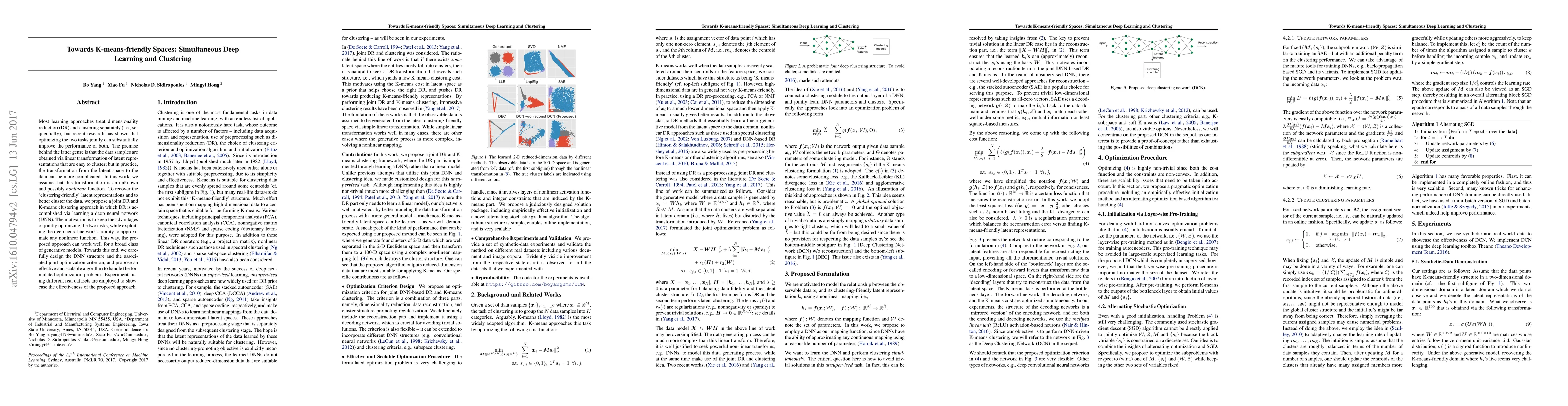 This paper proposes a joint deep learning and K-means clustering approach to optimize dimensionality reduction and clustering simultaneously. It leverages a deep neural network to approximate the unknown nonlinear transformation from latent representations to data, aiming to recover "clustering-friendly" latent spaces and improve clustering performance.