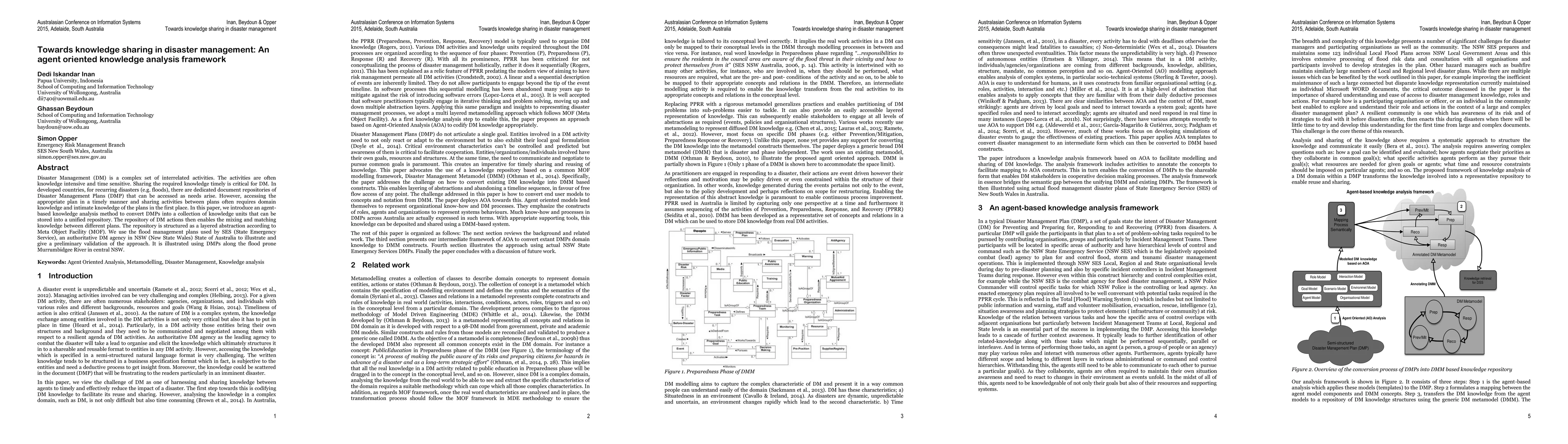 Disaster Management (DM) is a complex set of interrelated activities. The activities are often knowledge intensive and time sensitive. Sharing the required knowledge timely is critical for DM. In developed countries, for recurring disasters (e.g. floods), there are dedicated document repositories of Disaster Management Plans (DMP) that can be accessed as needs arise. However, accessing the appropriate plan in a timely manner and sharing activities between plans often requires domain knowledge and intimate knowledge of the plans in the first place. In this paper, we introduce an agent-based knowledge analysis method to convert DMPs into a collection of knowledge units that can be stored into a unified repository. The repository of DM actions then enables the mixing and matching knowledge between different plans. The repository is structured as a layered abstraction according to Meta Object Facility (MOF). We use the flood management plans used by SES in NSW to illustrate and give a preliminary validation of the approach. It is illustrated using DMPs along the flood prone Murrumbidgee River in central NSW.