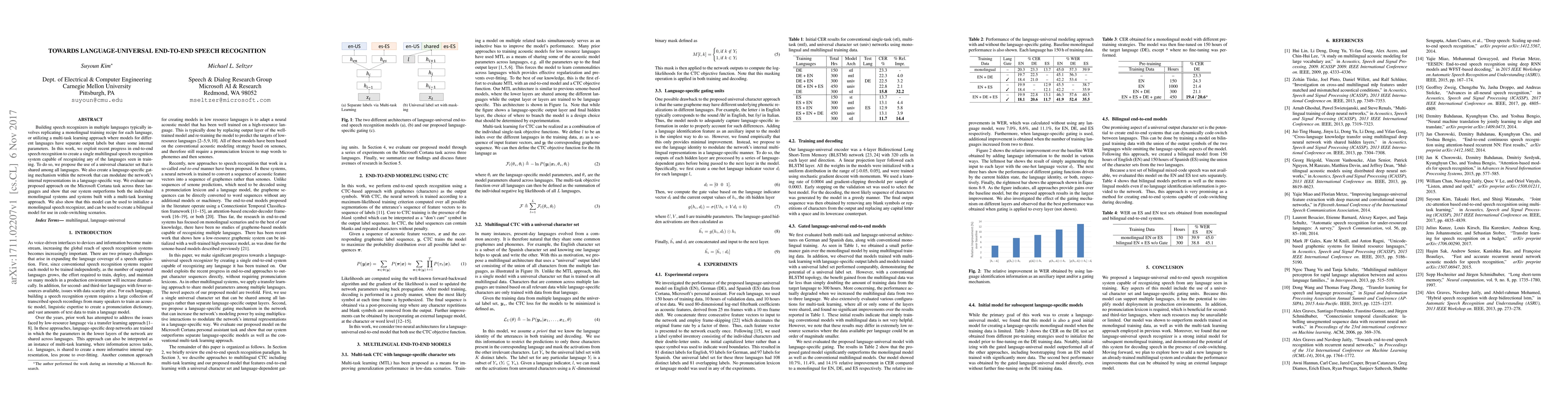 This paper proposes a multilingual end-to-end speech recognition system that leverages a universal character set and a language-specific gating mechanism to recognize multiple languages from a single model. The approach outperforms monolingual and multi-task learning systems and can initialize monolingual models and create bilingual models for code-switching.