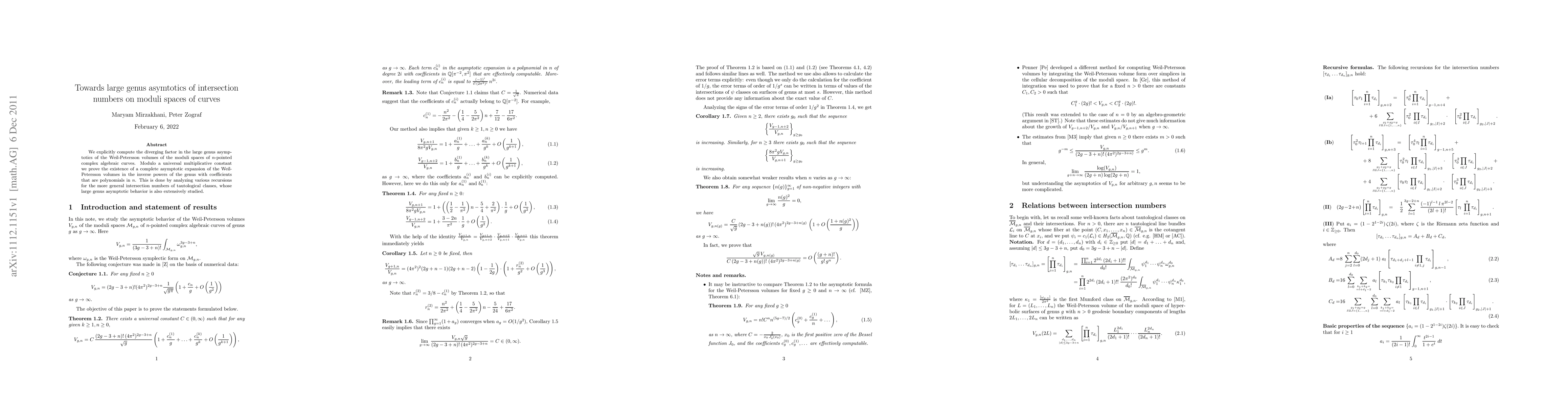 This paper computes the diverging factor in the asymptotics of Weil-Petersson volumes for moduli spaces of complex algebraic curves at large genus, proving an asymptotic expansion with polynomial coefficients in the number of points, and studies the recursions for intersection numbers of tautological classes.